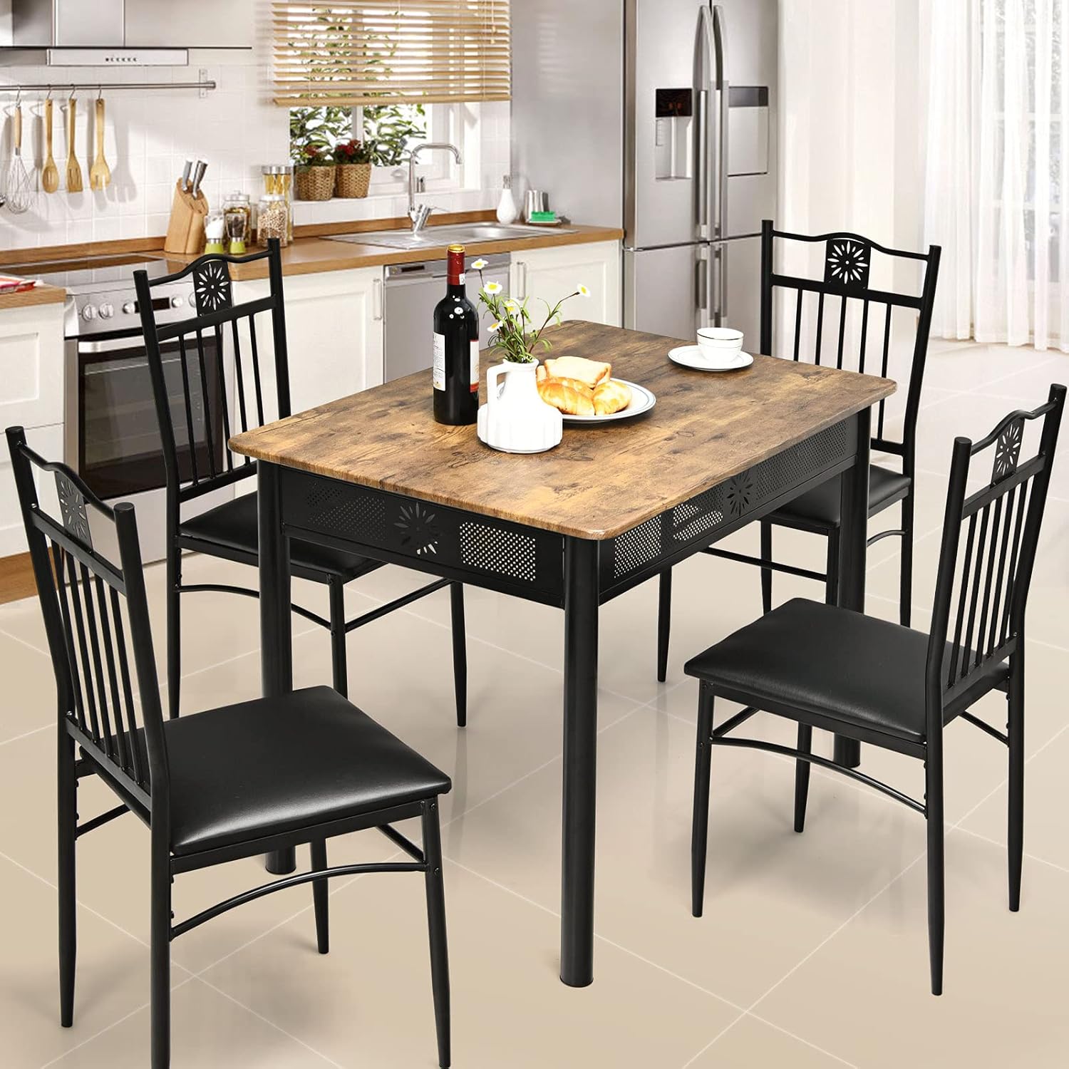 - Ensemble de table et 4 chaises de salle à manger : ce set de meuble est composé de 5 pièces dont 1 table rectangulaire et 4 chaises. Cet ensemble de taille appropriée offre un endroit approprié pour que 4 personnes puissent s'asseoir confortablement à la table en dégustant les plats délicieux et en discutant avec leurs proches.