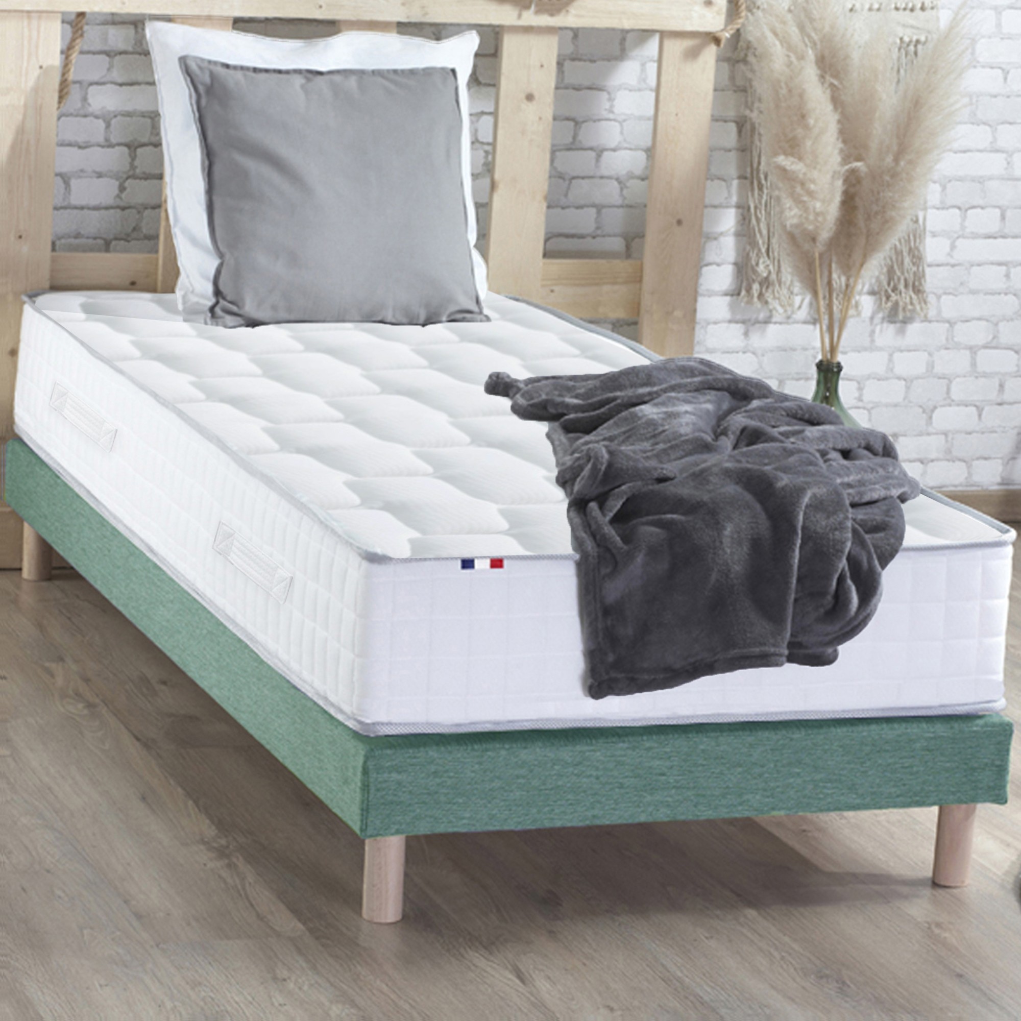 Un ensemble literie pensé pour un confort exceptionnel Offrez-vous le luxe d'un sommeil réparateur avec cet ensemble matelas à ressorts ensachés et mousse à mémoire de forme, accompagné d'un sommier robuste en bois massif. Chaque détail a été soigneusement conçu pour répondre à vos besoins de confort, de soutien et de durabilité. Matelas à ressorts et mémoire de forme : confort et innovation Avec une épaisseur généreuse de 24 cm, ce matelas combine la technologie des ressorts ensachés (jusqu'à 870 selon la taille) et une mousse visco-élastique à mémoire de forme HD. Les ressorts assurent une indépendance de couchage, idéale pour les couples, tandis que la mousse épouse parfaitement votre morphologie, réduisant les points de pression et offrant une sensation d'apesanteur. Ses deux faces réversibles apportent un confort optimal en toute saison : Face hiver : garnie de ouate polyester et de mousse mémoire pour une chaleur douce et enveloppante. Face été : composée de ouate respirante pour une fraîcheur agréable. Le coutil stretch 100 % polyester, traité anti-acariens et antibactériens, garantit une hygiène irréprochable et un toucher soyeux. Un sommier robuste et esthétique Ce sommier en bois massif, avec ses 12 lattes rigides et sa barre de renfort centrale, optimise le soutien du matelas tout en améliorant sa durabilité. Disponible en 5 coloris modernes (gris, noir, bleu denim, vert céladon et blanc), il s'intègre parfaitement dans n'importe quel intérieur. Livré en kit, il se monte rapidement pour une installation pratique et sans effort. Fabriqué en France, cet ensemble est certifié Oeko-Tex et PEFC, garantissant des matériaux sains et une gestion durable des ressources forestières. Avec une garantie de 5 ans pour le matelas et de 2 ans pour le sommier, cet ensemble est un choix fiable . Transformez vos nuits avec cet ensemble matelas et sommier, conçu pour combiner confort, soutien et design, tout en respectant vos exigences en matière de qualité.