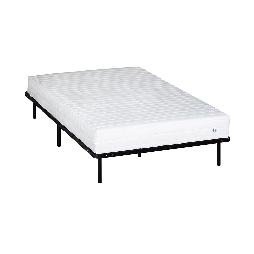 Garnissage Âme intérieure du matelas (certifiée CertiPUR) : 10 cm de mousse Haute Densité de 25 kg/m³ + 2 cm de latex Like de 65 kg/m³ Housse amovible (labellisée Oeko-Tex) : Tissu stretch 100% polyester garni de 250 gr/m² de fibres polyester Cadre à lattes : Structure tubulaire en métal (peinture époxy) - Lattes en bois multiplis (peuplier) - Pieds en métal (peinture époxy)