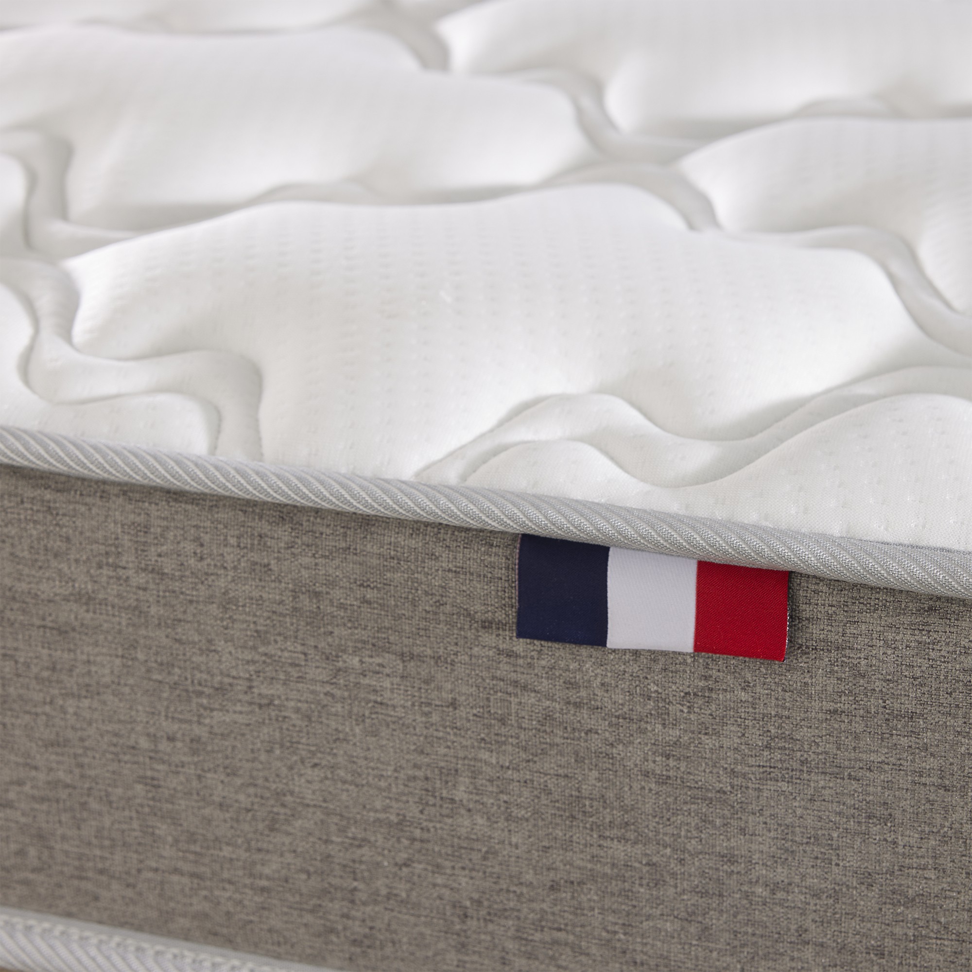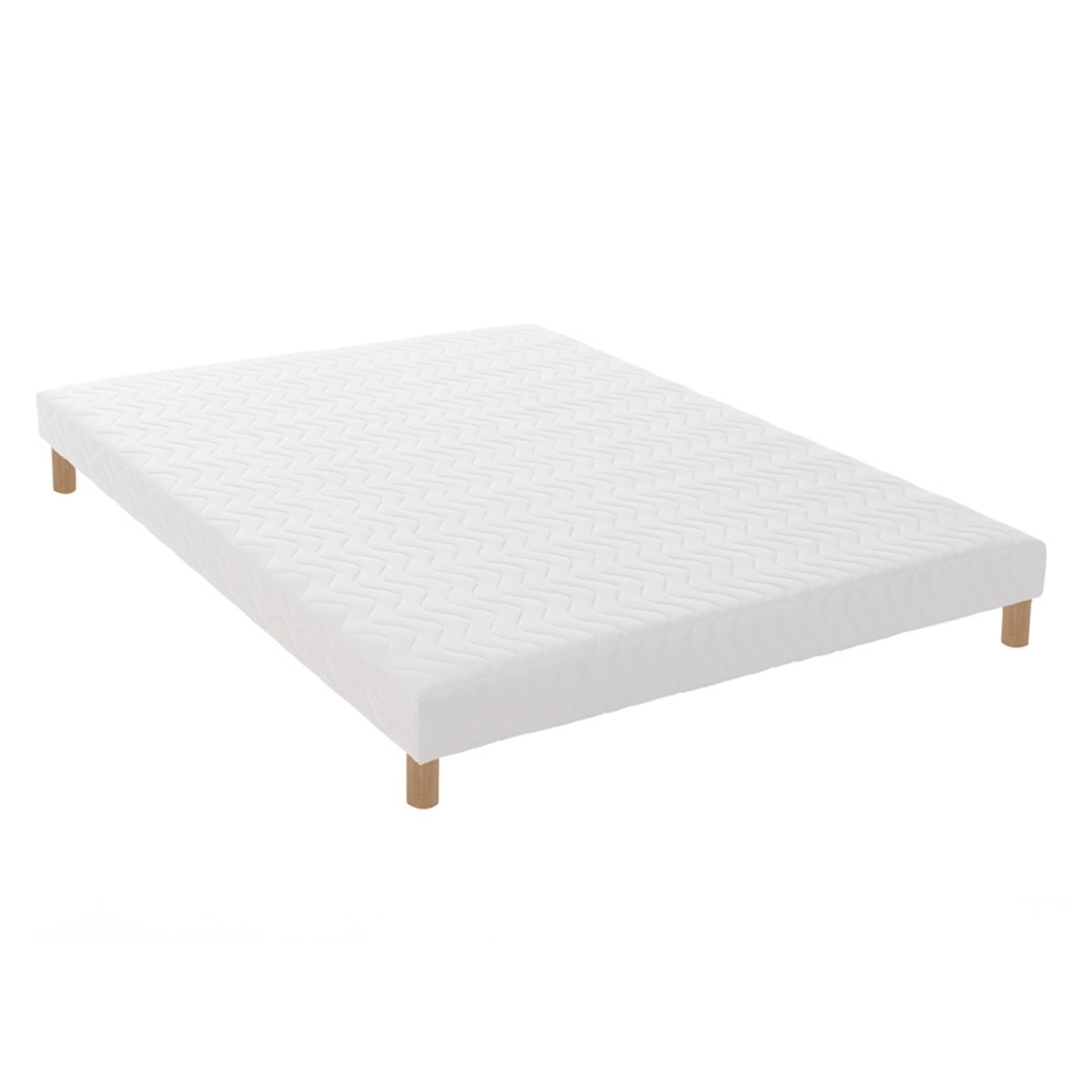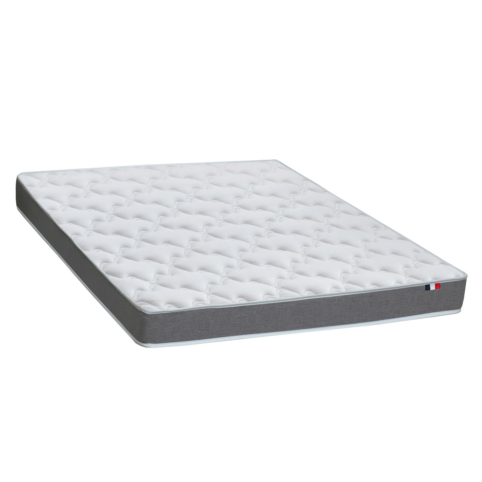 Un ensemble conçu pour un confort durable Offrez-vous des nuits reposantes avec cet ensemble matelas 100 % mousse polyuréthane ferme et sommier en bois massif. Pensé pour allier tonicité, soutien et longévité, il répond aux attentes des dormeurs en quête de fermeté et de qualité, tout en s'intégrant parfaitement dans votre intérieur. Un matelas ferme et tonique Doté d'une épaisseur de 16 cm, ce matelas est composé d'une âme en mousse polyuréthane haute densité (25 kg/m³). Sa conception garantit un soutien ferme et un accueil tonique, idéal pour maintenir votre colonne vertébrale dans une position optimale. Pour un confort adapté à chaque saison, il dispose de deux faces : Face hiver : 200 g/m² de ouate hypoallergénique pour une chaleur agréable. Face été : 200 g/m² de ouate hypoallergénique pour une sensation de fraîcheur. Certifié Oeko-Tex, il garantit l'absence de substances nocives, vous assurant un sommeil sain et sécurisé. Un sommier robuste et élégant Associez votre matelas à un sommier en bois massif, conçu pour apporter stabilité et esthétique. Avec ses 12 lattes rigides, et sa barre de renfort centrale, ce sommier optimise le soutien et prolonge la durée de vie de votre literie. Personnalisez votre décoration avec ses 5 coloris au choix : gris, noir, bleu denim, vert céladon ou blanc. Une qualité et un savoir-faire français Fabriqué en France et certifié ISO 9001, cet ensemble reflète un engagement pour la qualité et la durabilité. Le sommier est certifié PEFC, garantissant l'utilisation de bois issu de forêts gérées de manière responsable. Avec ses pieds inclus et un montage facile, cet ensemble s'intègre parfaitement à votre quotidien. Un ensemble pensé pour durer Retournez votre matelas régulièrement et profitez d'un confort durable. Avec cet ensemble, faites de vos nuits un véritable moment de bien-être, alliant robustesse, esthétique et qualité française.