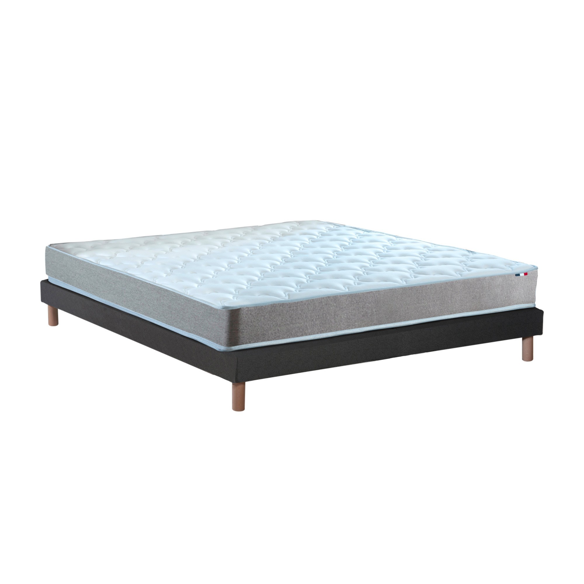 Un ensemble conçu pour un confort durable Offrez-vous des nuits reposantes avec cet ensemble matelas 100 % mousse polyuréthane ferme et sommier en bois massif. Pensé pour allier tonicité, soutien et longévité, il répond aux attentes des dormeurs en quête de fermeté et de qualité, tout en s'intégrant parfaitement dans votre intérieur. Un matelas ferme et tonique Doté d'une épaisseur de 16 cm, ce matelas est composé d'une âme en mousse polyuréthane haute densité (25 kg/m³). Sa conception garantit un soutien ferme et un accueil tonique, idéal pour maintenir votre colonne vertébrale dans une position optimale. Pour un confort adapté à chaque saison, il dispose de deux faces : Face hiver : 200 g/m² de ouate hypoallergénique pour une chaleur agréable. Face été : 200 g/m² de ouate hypoallergénique pour une sensation de fraîcheur. Certifié Oeko-Tex, il garantit l'absence de substances nocives, vous assurant un sommeil sain et sécurisé. Un sommier robuste et élégant Associez votre matelas à un sommier en bois massif, conçu pour apporter stabilité et esthétique. Avec ses 12 lattes rigides, et sa barre de renfort centrale, ce sommier optimise le soutien et prolonge la durée de vie de votre literie. Personnalisez votre décoration avec ses 5 coloris au choix : gris, noir, bleu denim, vert céladon ou blanc. Une qualité et un savoir-faire français Fabriqué en France et certifié ISO 9001, cet ensemble reflète un engagement pour la qualité et la durabilité. Le sommier est certifié PEFC, garantissant l'utilisation de bois issu de forêts gérées de manière responsable. Avec ses pieds inclus et un montage facile, cet ensemble s'intègre parfaitement à votre quotidien. Un ensemble pensé pour durer Retournez votre matelas régulièrement et profitez d'un confort durable. Avec cet ensemble, faites de vos nuits un véritable moment de bien-être, alliant robustesse, esthétique et qualité française.