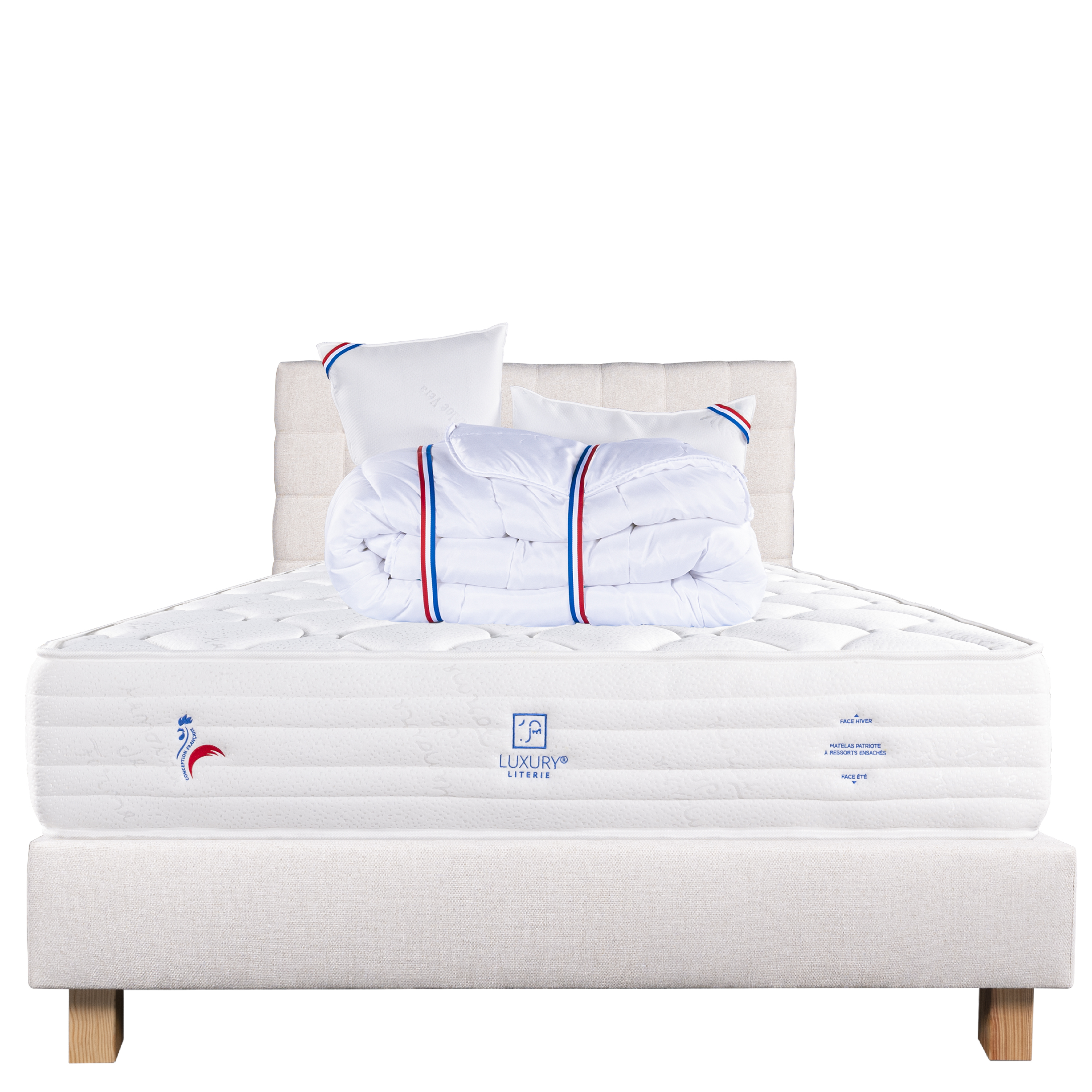 Ensemble matelas PATRIOTE MOUSSE ferme 7/10, épaisseur 26cm + sommier tapissier + tête de lit + couette + oreillers