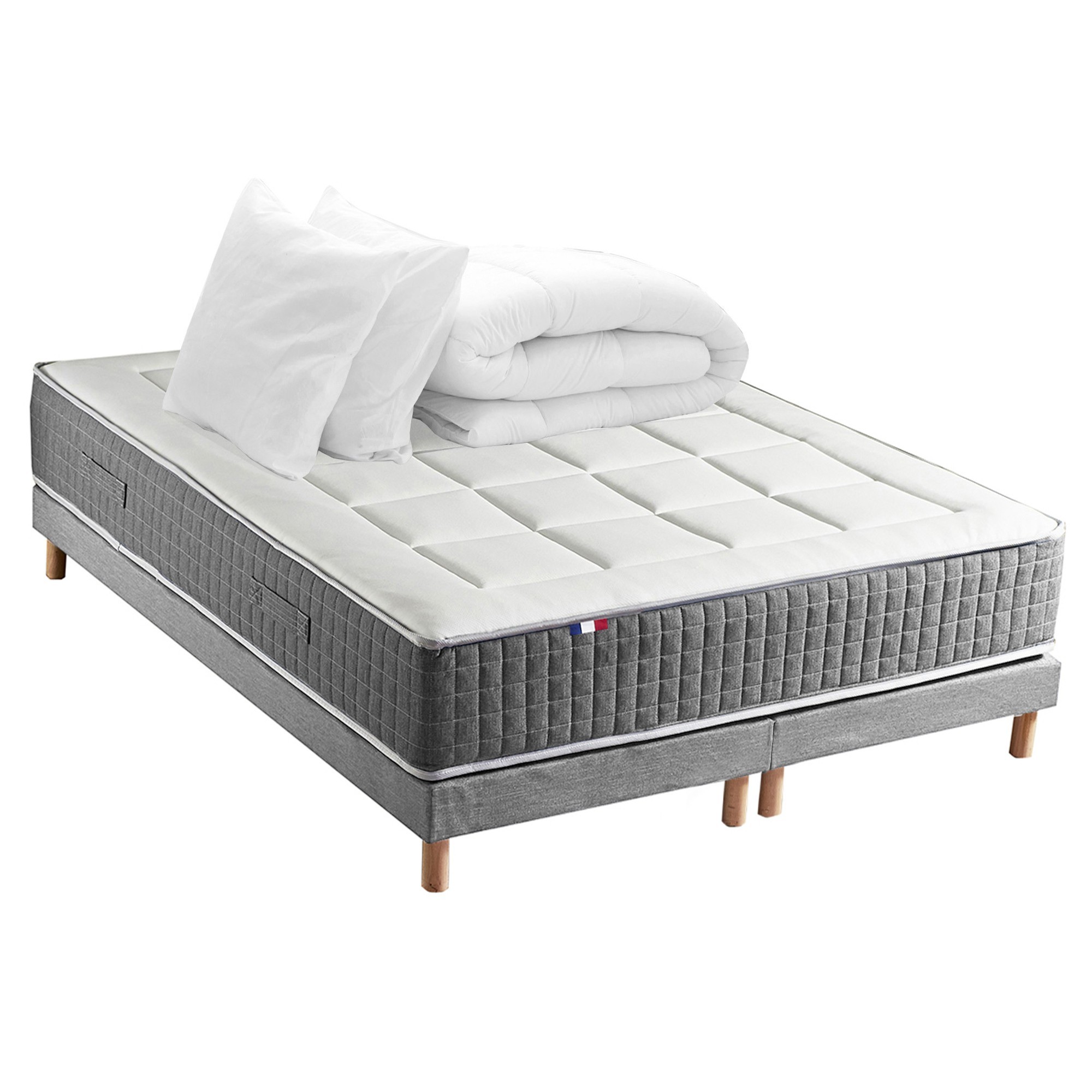 Ensemble Matelas Ressort 7 zones H.28cm + Sommier + couette + oreillers Fabriqué en France MAX - 2x80 x 2