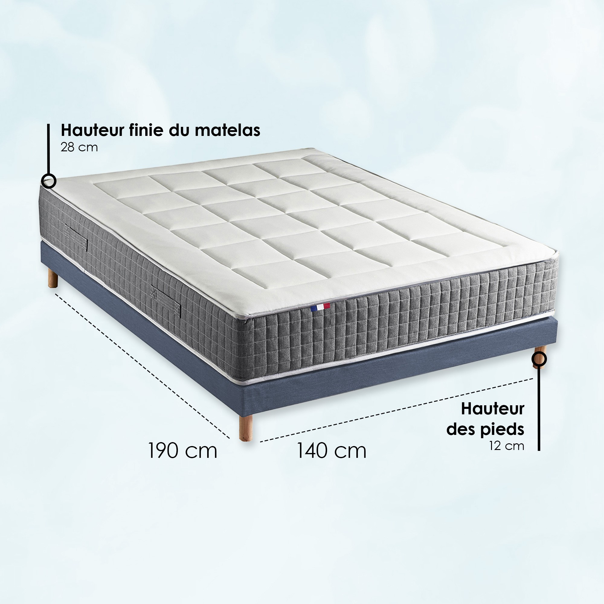 Ensemble Matelas Ressort 7 zones H.28cm + Sommier Fabriqué en France MAX - 140 x 190 cm, Sommier - Bleu d
