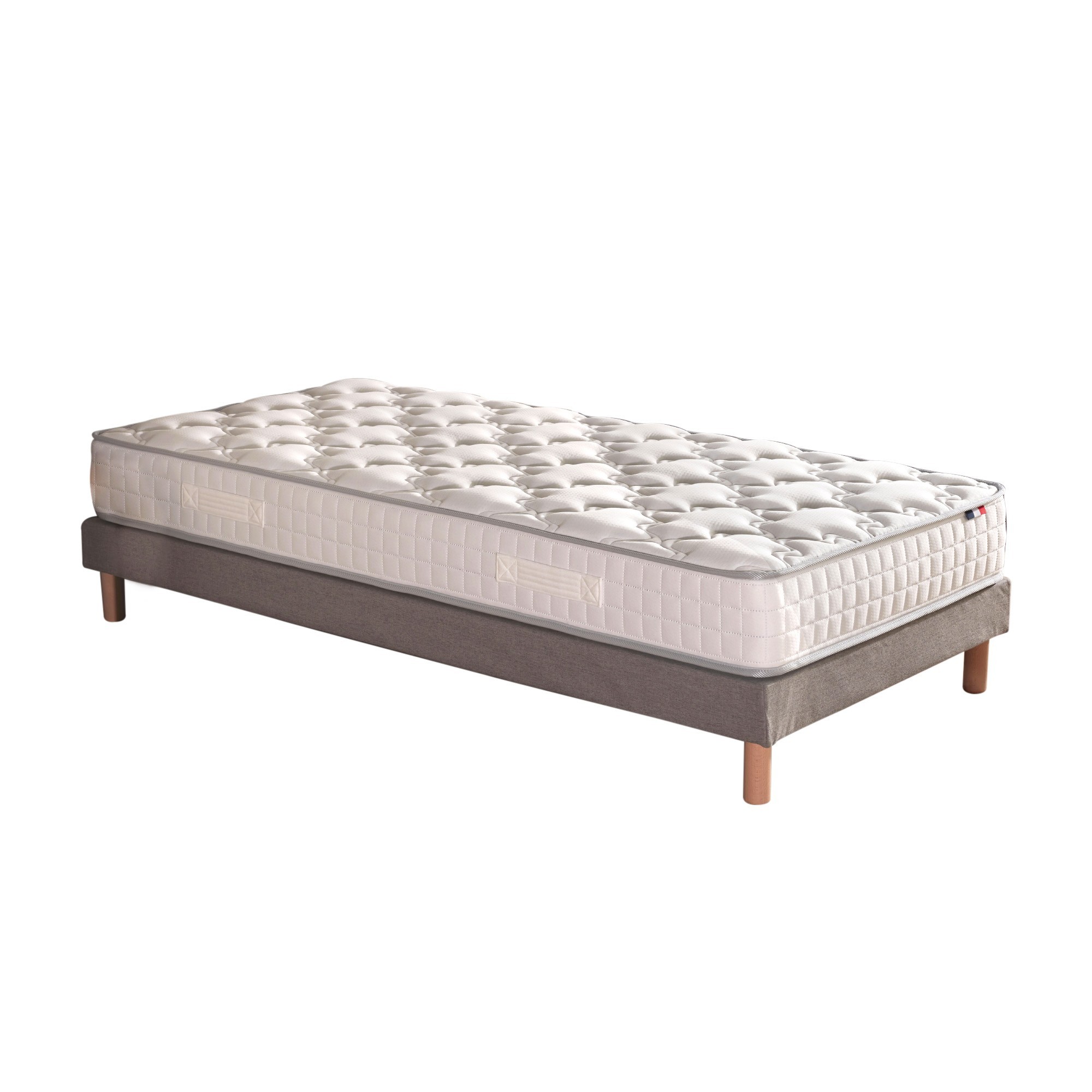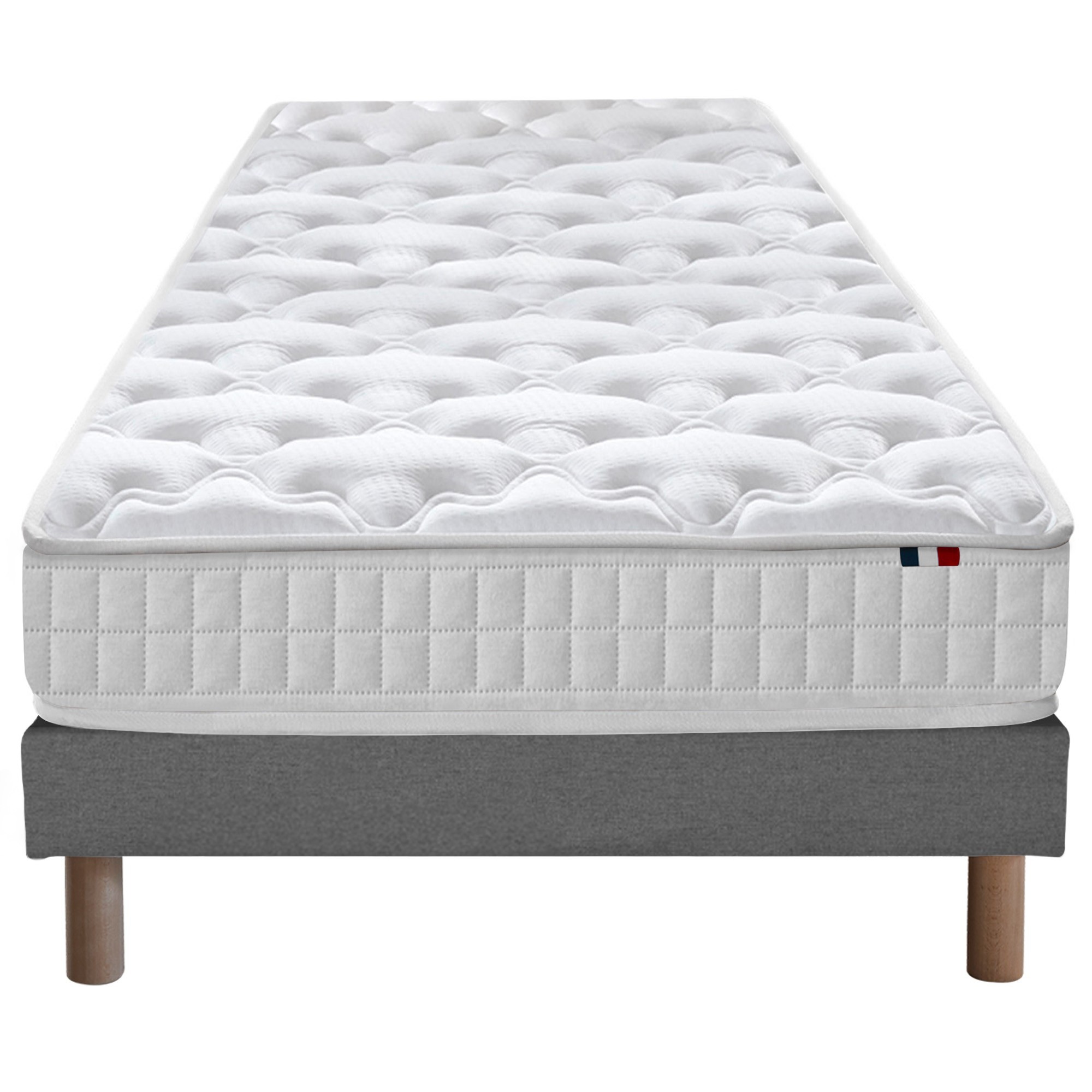 Pack ensemble matelas ressorts + sommier Offrez-vous un confort optimal avec ce pack complet. Composé d'un matelas à ressorts et d'un sommier en bois massif, cet ensemble a été pensé pour améliorer la qualité de vos nuits. Pratique, durable et fabriqué en France, il répond à vos besoins de soutien et de durabilité. Le matelas ressorts : un soutien ferme Ce matelas de 20 cm d'épaisseur offre un accueil équilibré avec un soutien ferme. Grâce à ses ressorts ensachés, profitez d'une indépendance de couchage idéale pour des nuits sereines. Caractéristiques techniques Nombre de ressorts : 378 (90x190), 594 (140x190), 700 (160x200) Isolation : 2 cm de mousse 25 kg/m³ Face de couchage : 5 mm de mousse + 200 g/m² ouate hypoallergénique Coutil : Stretch 100 % polyester traité anti-acariens Le matelas, livré roulé. Pour en maximiser la durée de vie, pensez à utiliser un protège-matelas et à retourner régulièrement la literie. Le sommier en bois massif : solide et pratique Le sommier en bois massif apporte une base robuste à votre matelas. Avec une épaisseur de 12 cm, il améliore le confort général et optimise la répartition du poids. Spécifications 12 lattes rigides et barre centrale Toile de fond anti-poussière Coloris : beige ou gris Bois certifié PEFC pour une gestion durable des forêts Fabrication française et garanties Ce pack est conçu en France dans une usine certifiée ISO 9001. Le matelas bénéficie d'une garantie de 5 ans et le sommier d'une garantie de 2 ans. Livraison rapide et pratique grâce à son conditionnement adapté. Un ensemble idéal pour vos nuits, alliant confort, robustesse et sérénité.