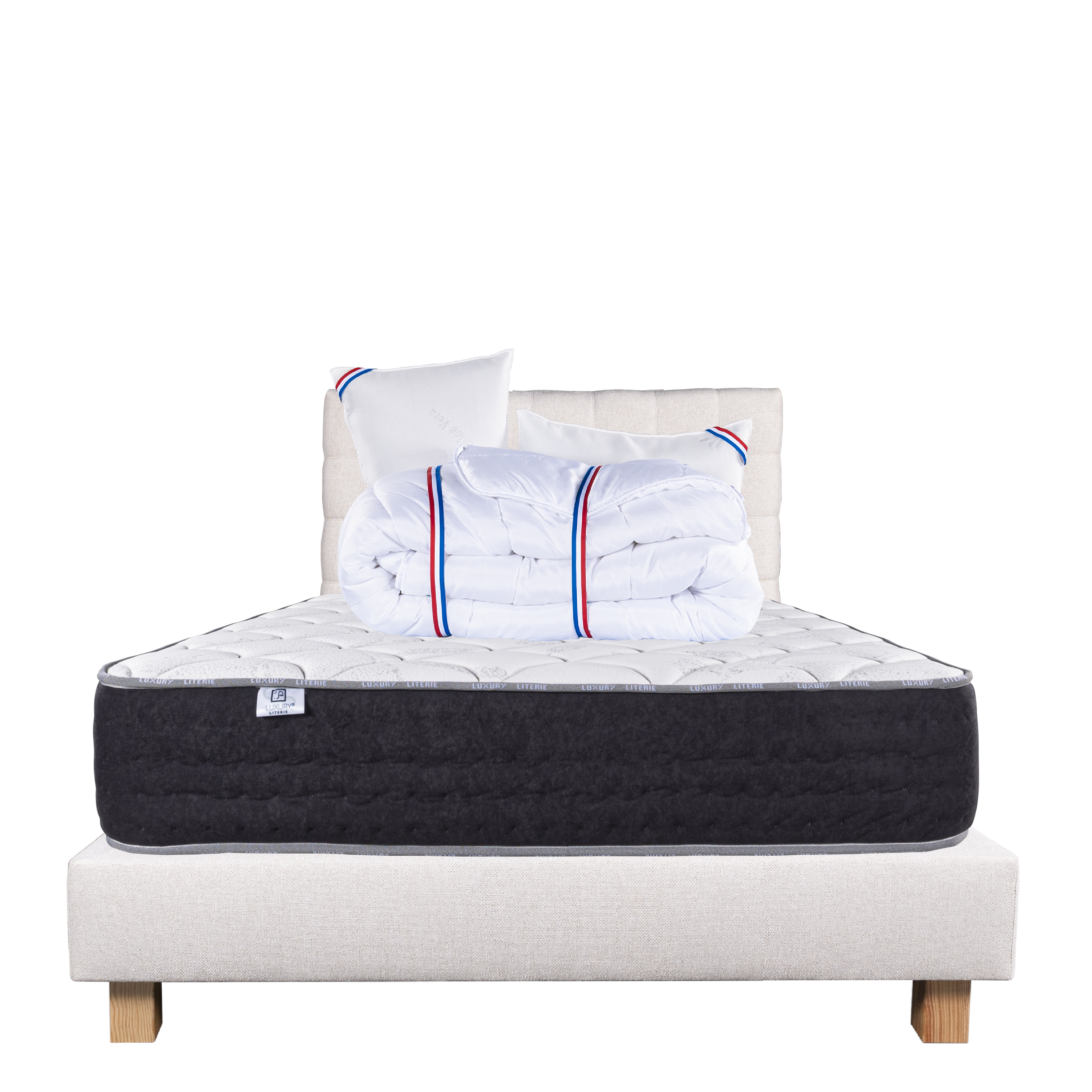 Ensemble matelas SÉRÉNITÉ ferme 7/10, épaisseur 27cm + sommier tapissier + tête de lit + couette + oreillers