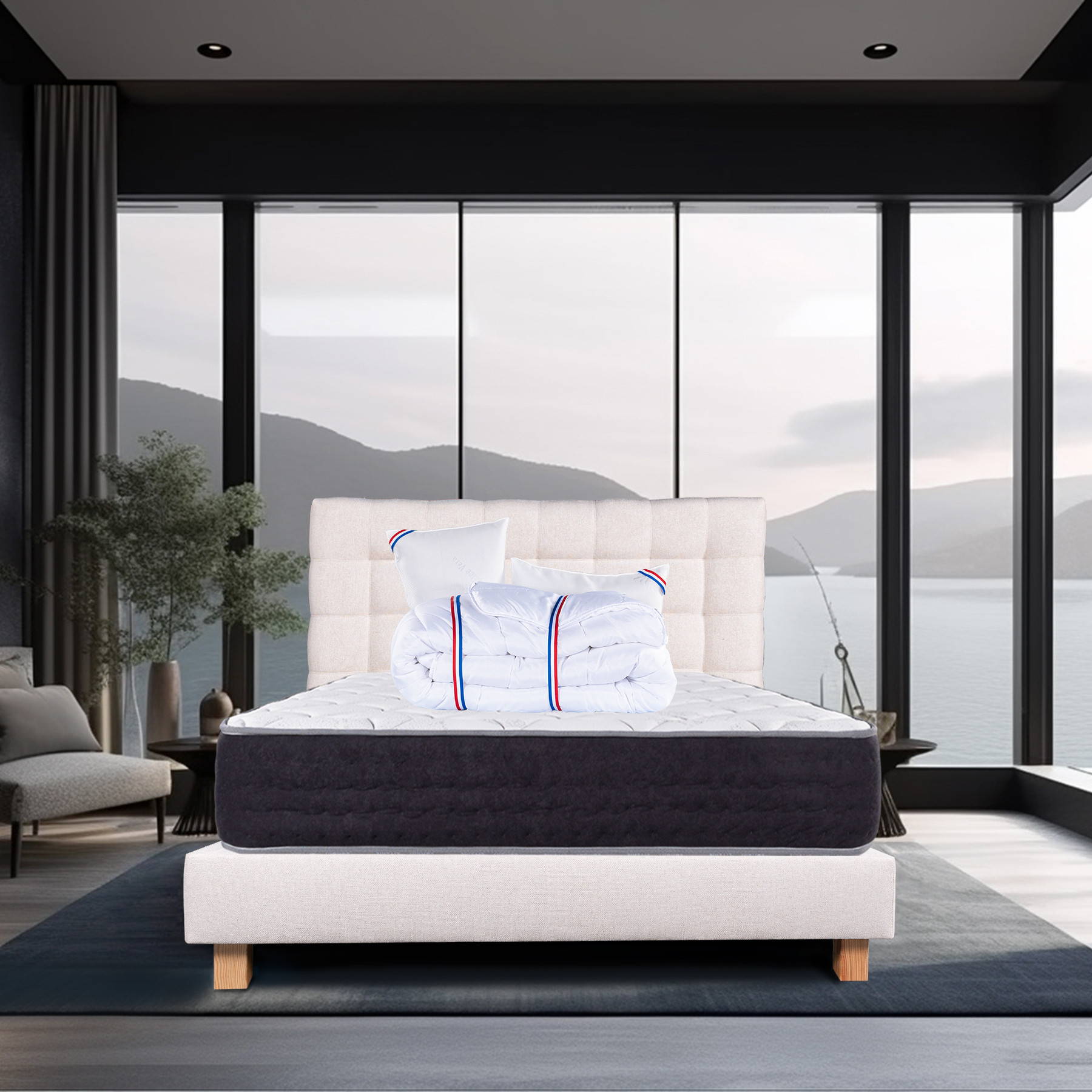 Ce matelas allie le meilleur des deux mondes : des ressorts ensachés durables pour un soutien exceptionnel et une mousse de haute qualité pour un confort incomparable. Vous méritez une bonne nuit de sommeil, et ce matelas est là pour vous offrir exactement cela. Ne cherchez pas plus loin, c'est le matelas de vos rêves. Nous avons souhaité le combiner avec une couette de 450g avec une très bonne régulation thermique. Elle possède un bon gonflant avec un toucher soyeux. Ainsi que deux oreillers en 60cm x 40cm avec un garnissage 100% mousse viscoélastique. Pour compléter ce pack nous avons selectionné notre sommier tapissier en bois massif, ainsi que la tête de lit. Investissez dans votre santé et votre bien-être avec le meilleur rapport qualité-prix du marché.