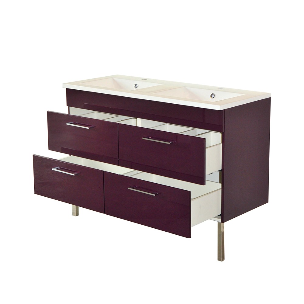 Ensemble meuble sous-vasque + vasque résine + miroir MILANOApportez une touche de couleur et de modernité dans votre salle de bain avec l'ensemble MILANO. Pratique, il dispose de 4 tiroirs sous la vasque pour pouvoir ranger tout le nécessaire de la salle de bain. Son plan de toilette double vasques est idéal pour permettre à toute la famille de se préparer en même temps. • Façades et côtés en MDF laqué Aubergine• Coulisses et charnières amorties• Poignées métal finition chromé brillant• Pieds H24 cm finition chromé brillantSOUS-VASQUE : L120 x P50 x H88• Dimensions intérieures des 4 tiroirs : L53 x P37 x H12,5• Tiroirs supérieurs avec découpe pour évacuationPLAN DE TOILETTE : L122 x P50 x H2,• Résine blanc brillant, double vasque• Dimensions des 2 cuves : L44 x P30 x H10GRAND MIROIR ADELE : L120 x P2,5 x H69,8Non inclus : système de vidange et robinetterieLivré démonté. A monter soi-mêmeDimensions: