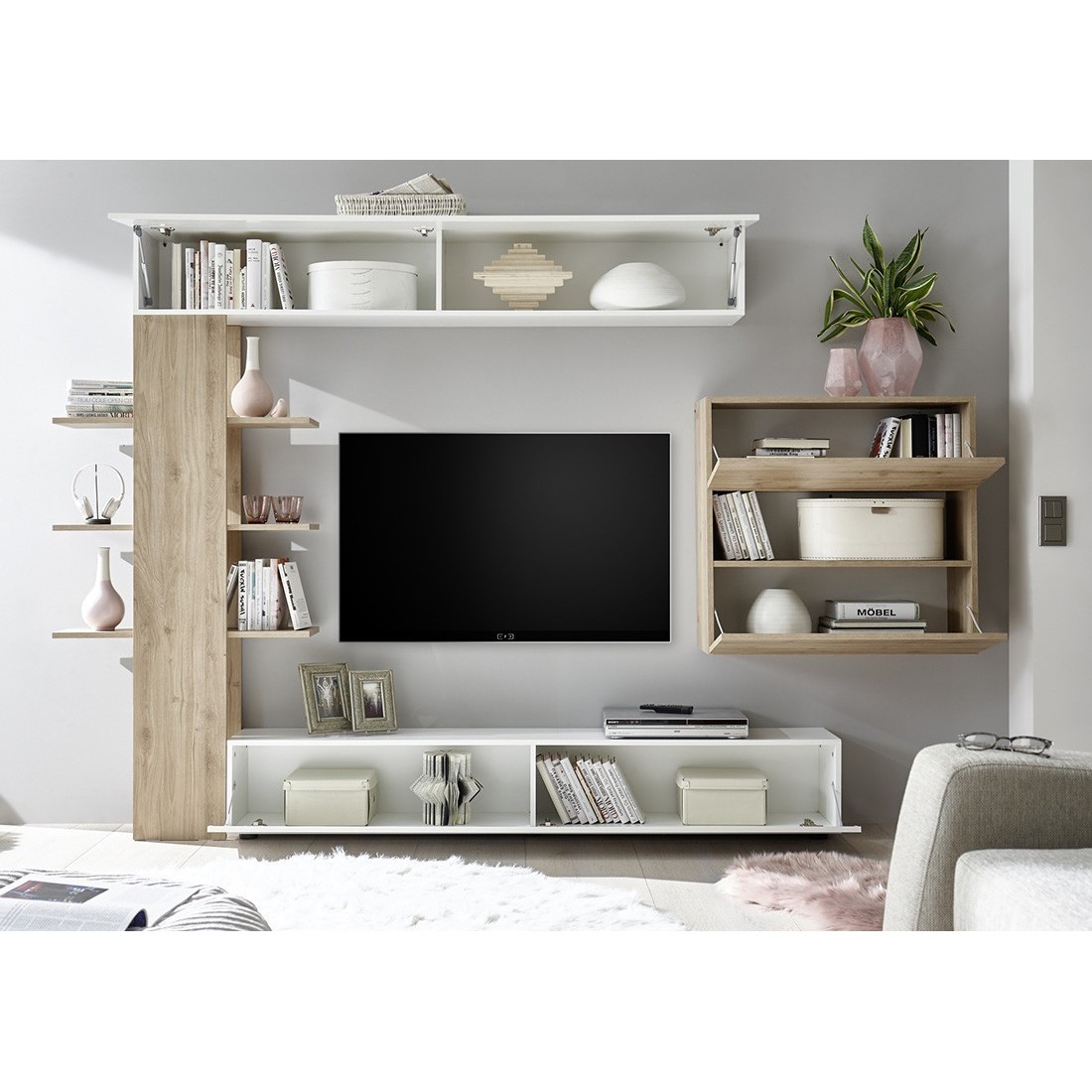 Ensemble meubles salon avec rangements, collection VASCO, blanc laqué/chêne clair