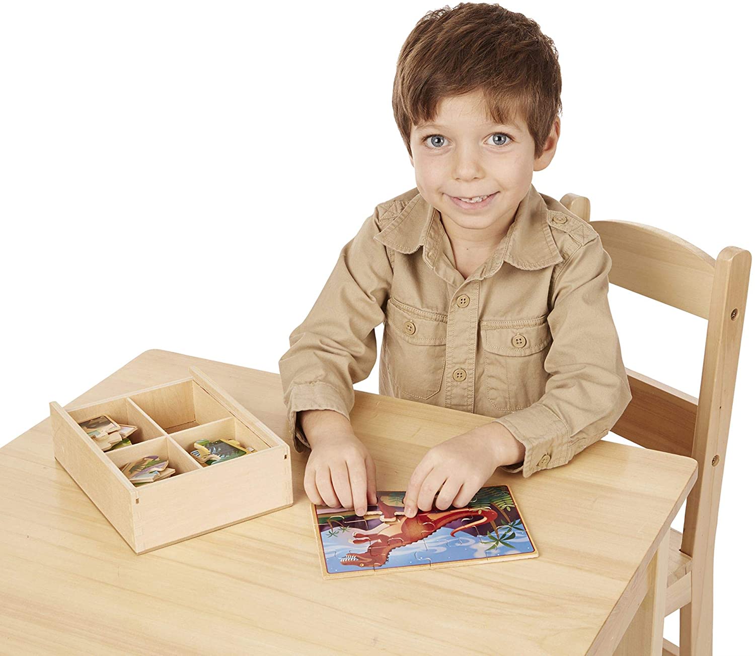 L'ensemble comprend quatre puzzles de dinosaures en bois de 12 pièces - un tricératops, un apatosaure, un stégosaure et un T-Rex - chacun rangé dans un compartiment séparé d'une solide boîte en bois ! Le couvercle de la boîte à glissière sert également de planche de puzzle pratique ! Chaque pièce du puzzle est codée sur la forme au dos pour un tri facile. Idéal pour voyager !