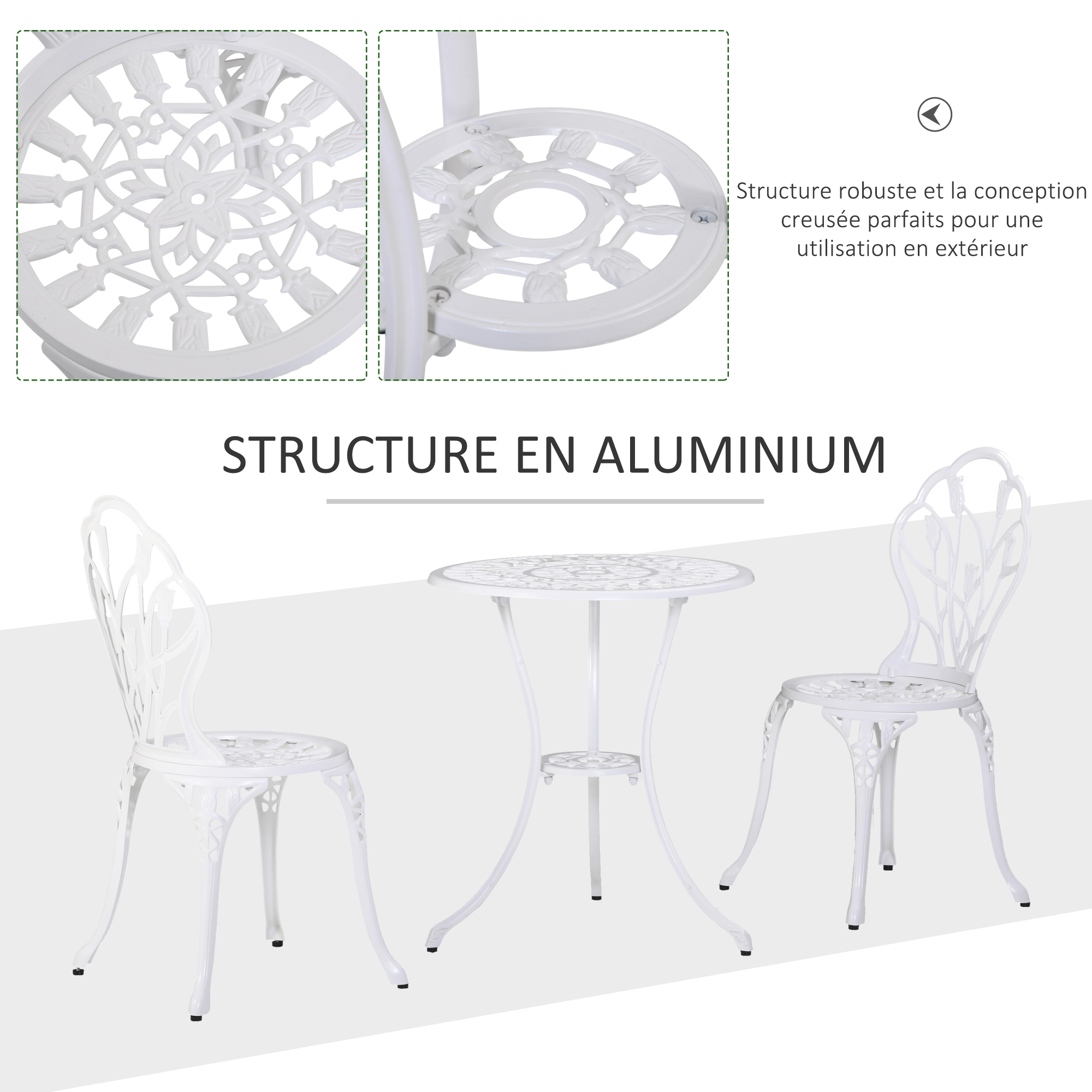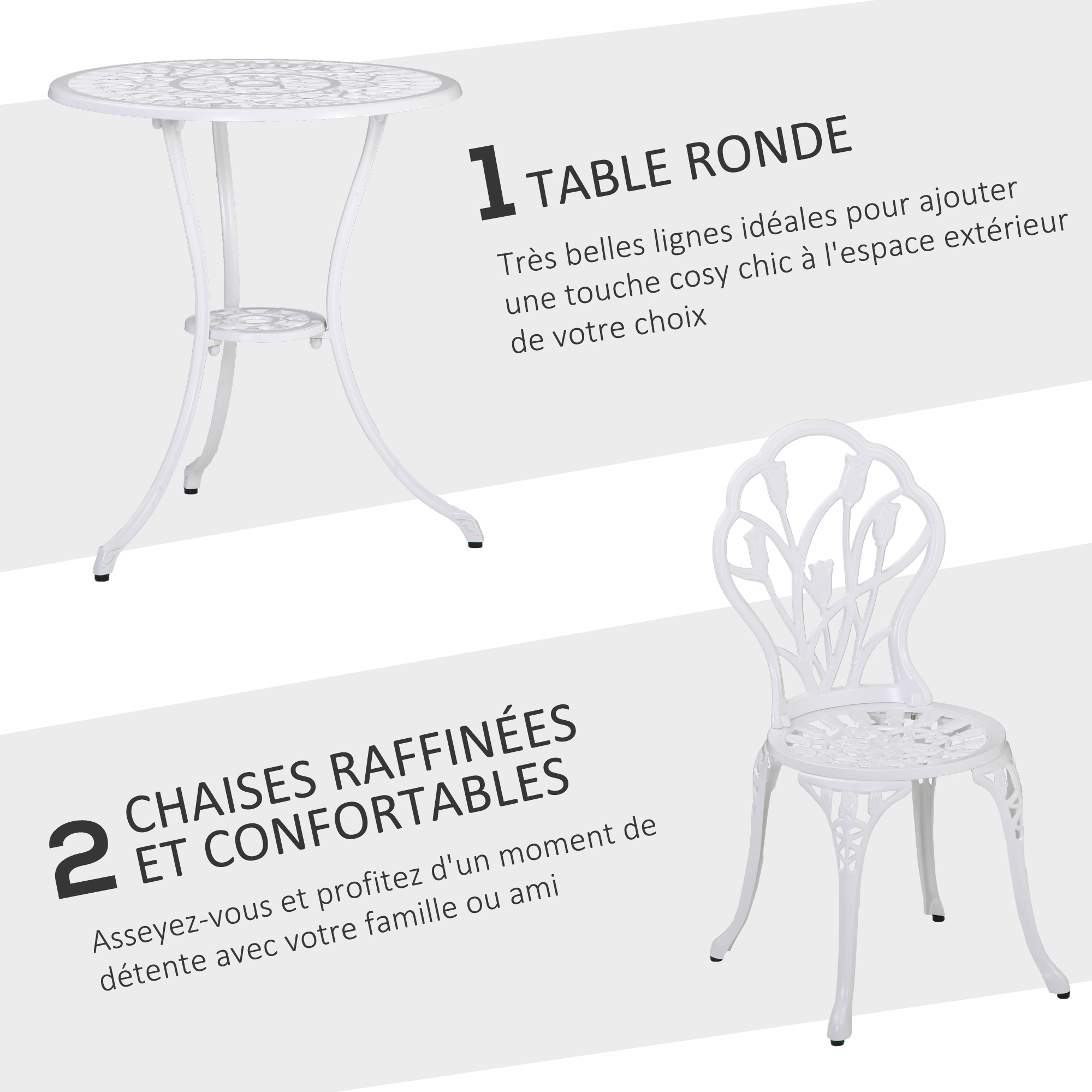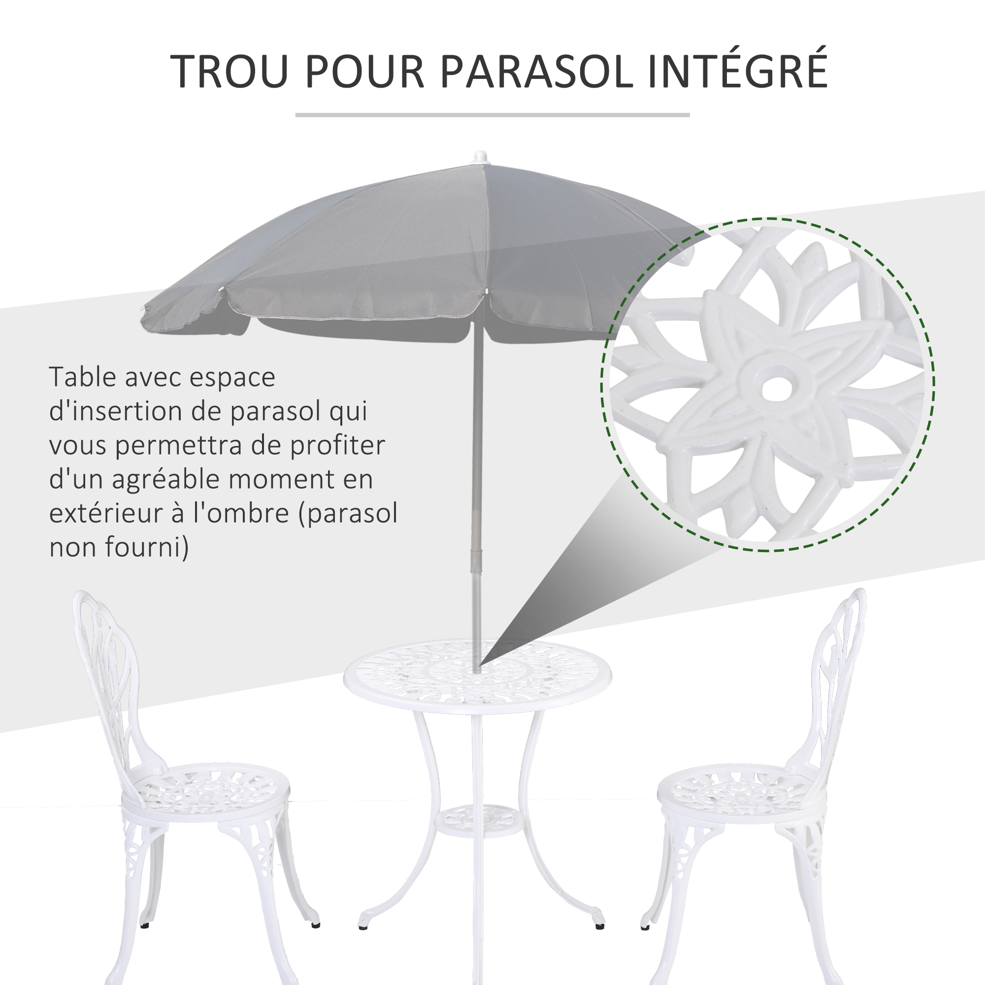 Ajoutez une touche d'élégance à votre jardin ou votre terrasse grâce à cet ensemble 3 pièces style rural chic. Fabriqué en fonte d'aluminium style fer forgé avec lignes fuselées, il sera du plus plus bel effet dans votre extérieur ! Sa table ronde avec espace d'insertion de parasol vous permettra de profiter d'un agréable moment en extérieur.