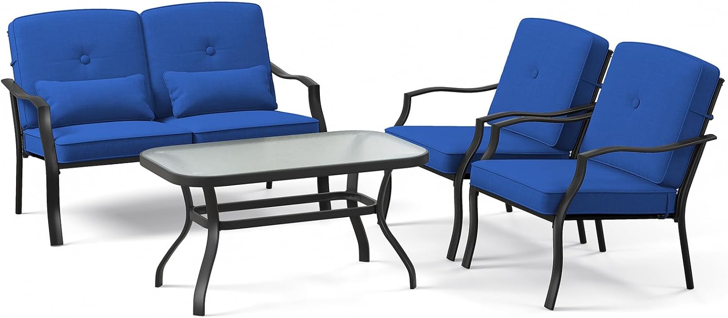 | Libellé | Ensemble salon de jardin 4 pièces en métal, ensemble de meubles extérieur avec table basse en verre trempé et coussins charge 300kg, pour patio |