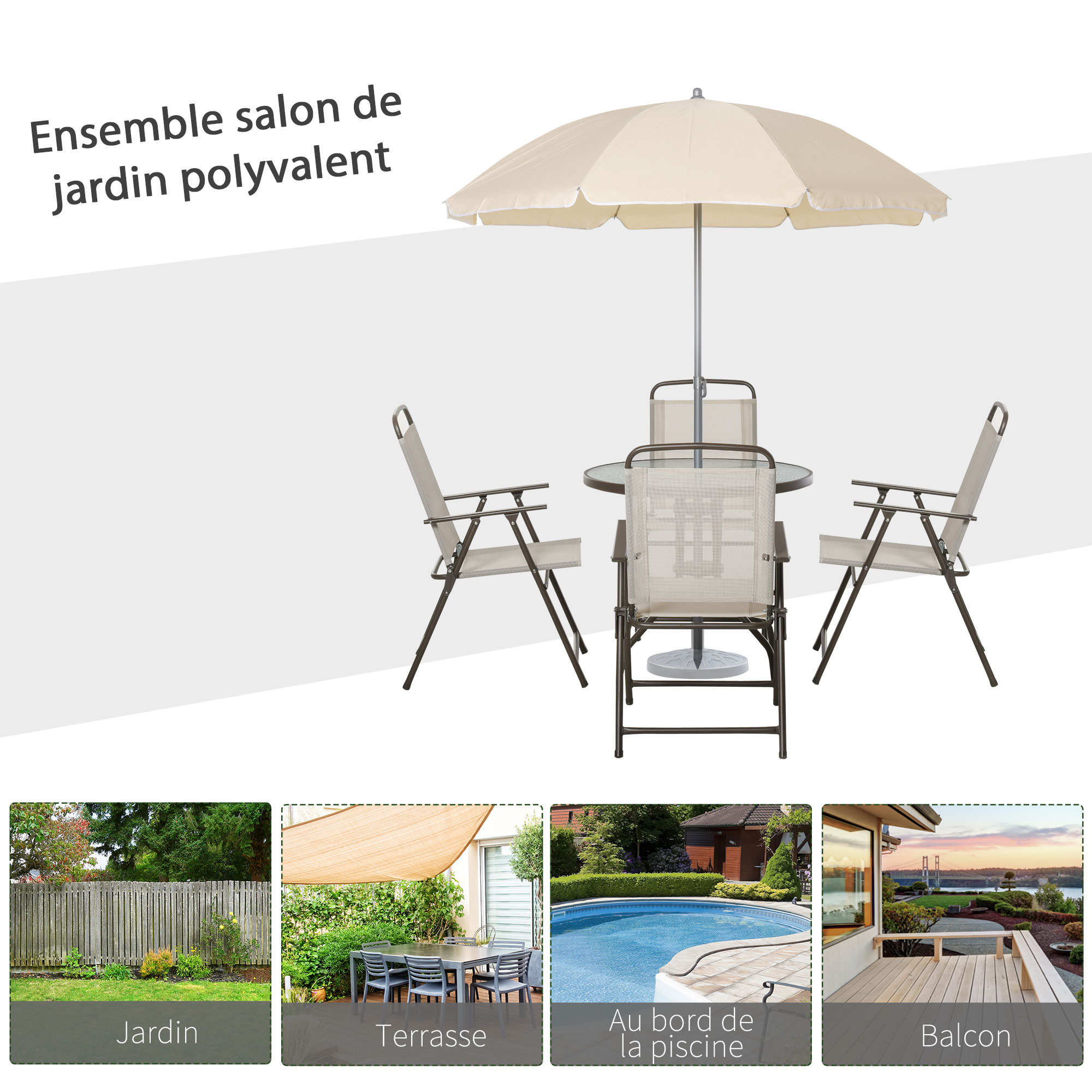 - Ensemble bistro complet composé de 4 chaises pliables, d'une table ronde et d'un parasol