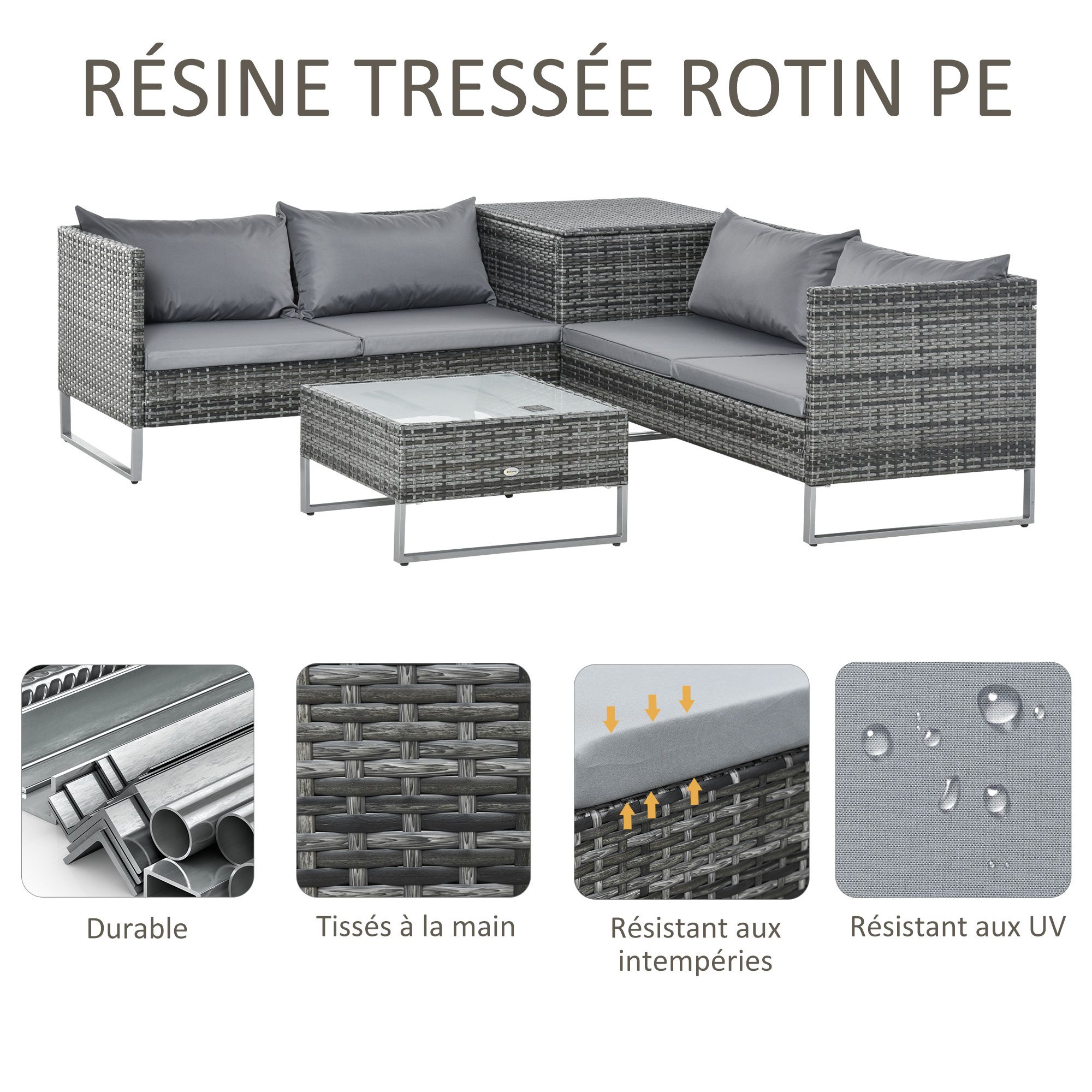 | Libellé | Ensemble salon de jardin d'angle 4 places - table basse, coffre - coussins assise déhoussables - métal époxy résine tressée gris |