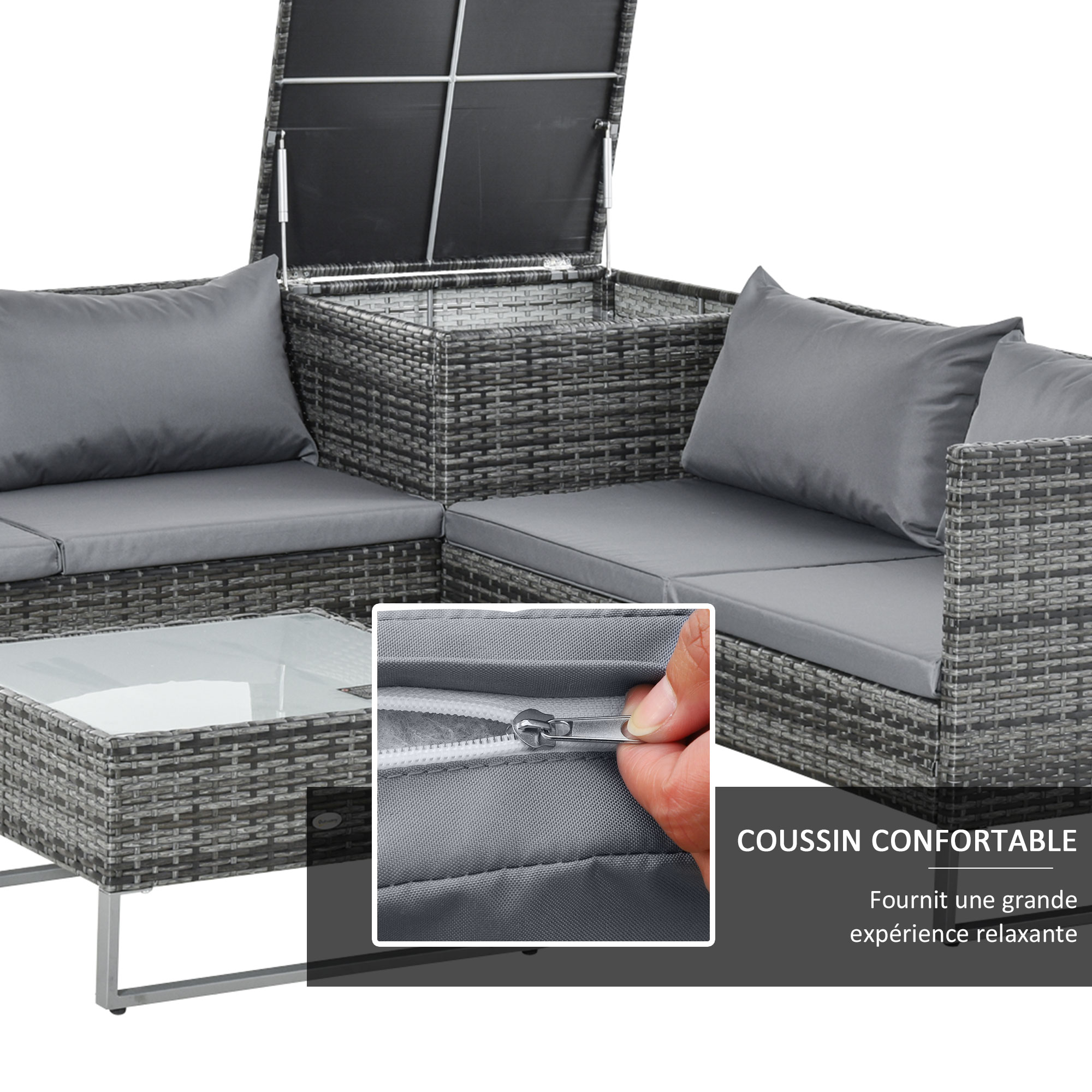 - Ensemble salon de jardin d'angle avec table basse et coffre de rangement très pratique