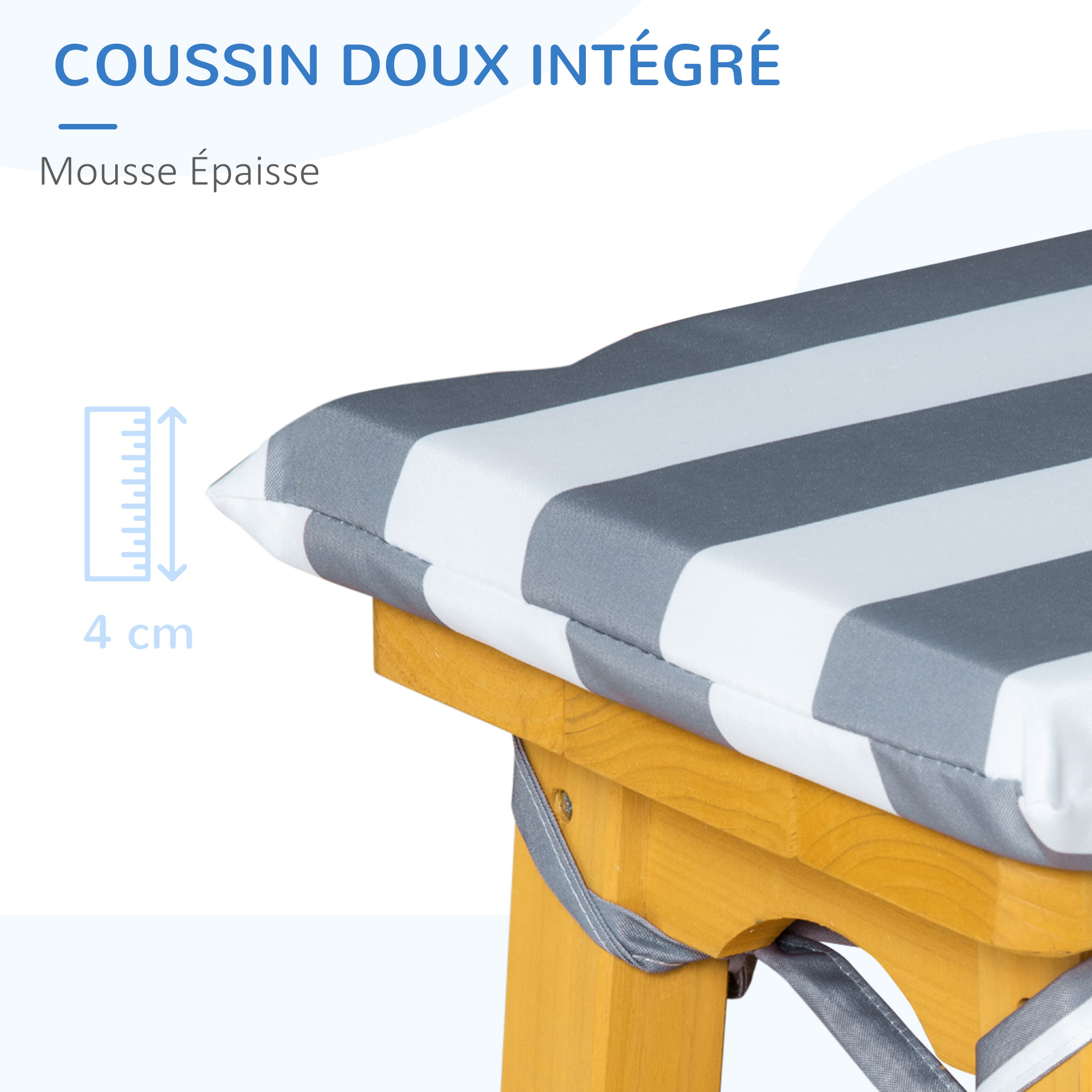 - Coussins de bancs grand confort : cordons d'attache, garnissage mousse haute densité avec revêtement doux en polyester