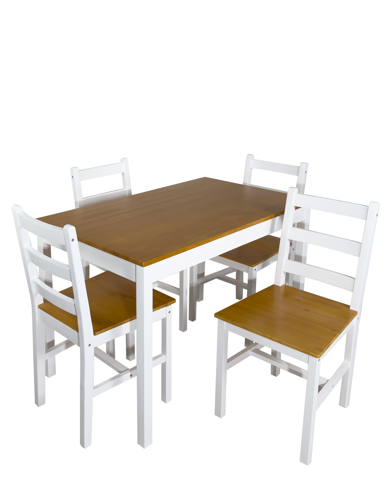 Voici NIL notre ensemble table de salle à manger cuisine et ses 4 chaises assorties. Dans un style classique chic et sobre, découvrez cette petite table en bois laqué blanc et miel idéale pour 4 couverts et ses chaises blanches assorties. Parfaite dans une petite cuisine familiale ou une salle à manger. La table et les chaises sont en pin massif, un bois robuste, léger et facile à entretenir. Des chaises à barreaux stables qui se positionnent parfaitement sous la table pour un encombrement minimum.