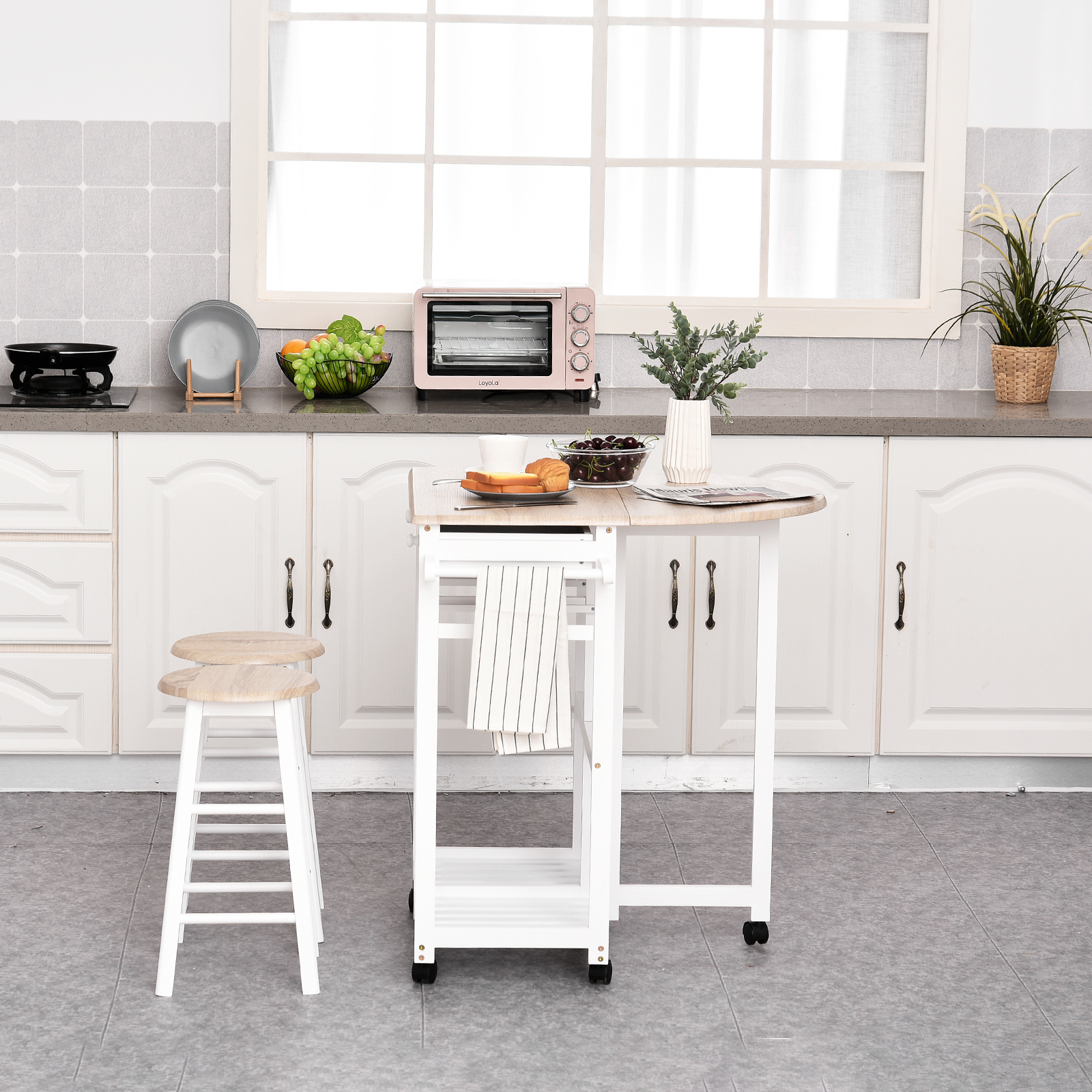 Ensemble table de bar pliable sur roulettes avec étagère et 2 tiroirs + 2 tabourets bois pin MDF blanc ch
