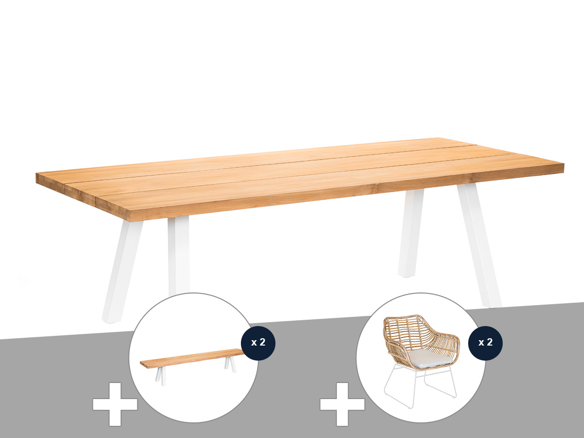 Ensemble table de jardin en teck Seychelles + 2 bancs en teck + 2 fauteuils - 10 places - Jardiline