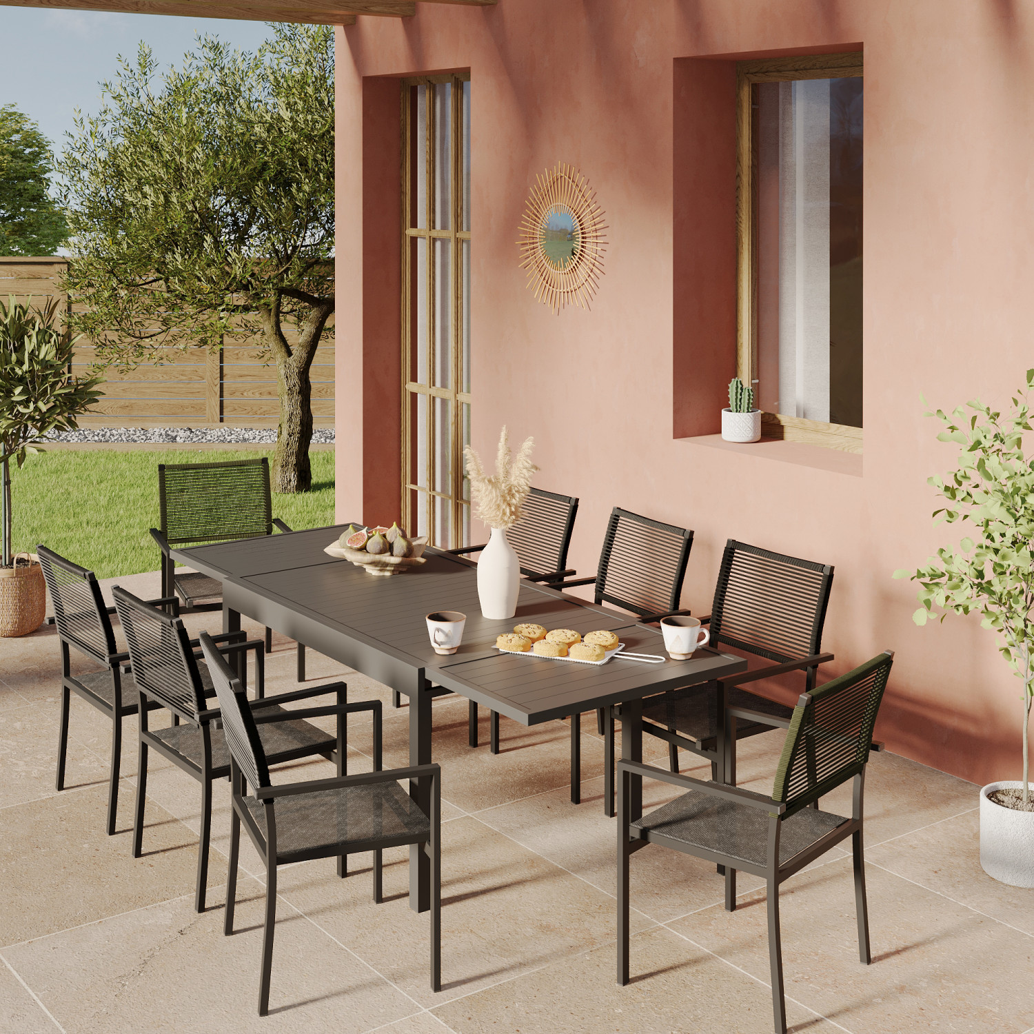 | Libellé | Ensemble Table de jardin extensible aluminium 135/270cm + 8 Fauteuils empilables corde Anthracite et vert olive - YERAZ 8 |