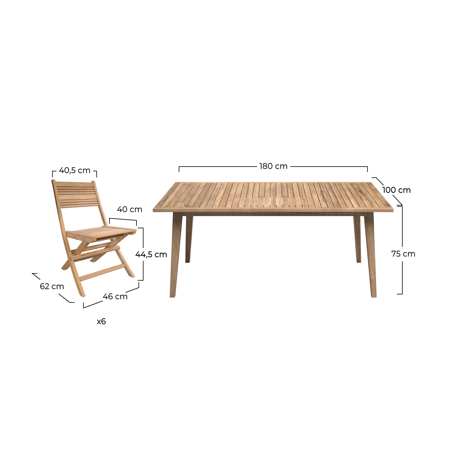 Les dimensions généreuses de la table (L 180 x l 100 x H 75 cm) en font un joyau pour votre terrasse ou jardin. Alliant élégance et modernité, les chaises en bois de teck massif ajoutent une touche authentique. Pratiques, elles se plient facilement pour un rangement aisé. L'assise généreuse assure un confort optimal.