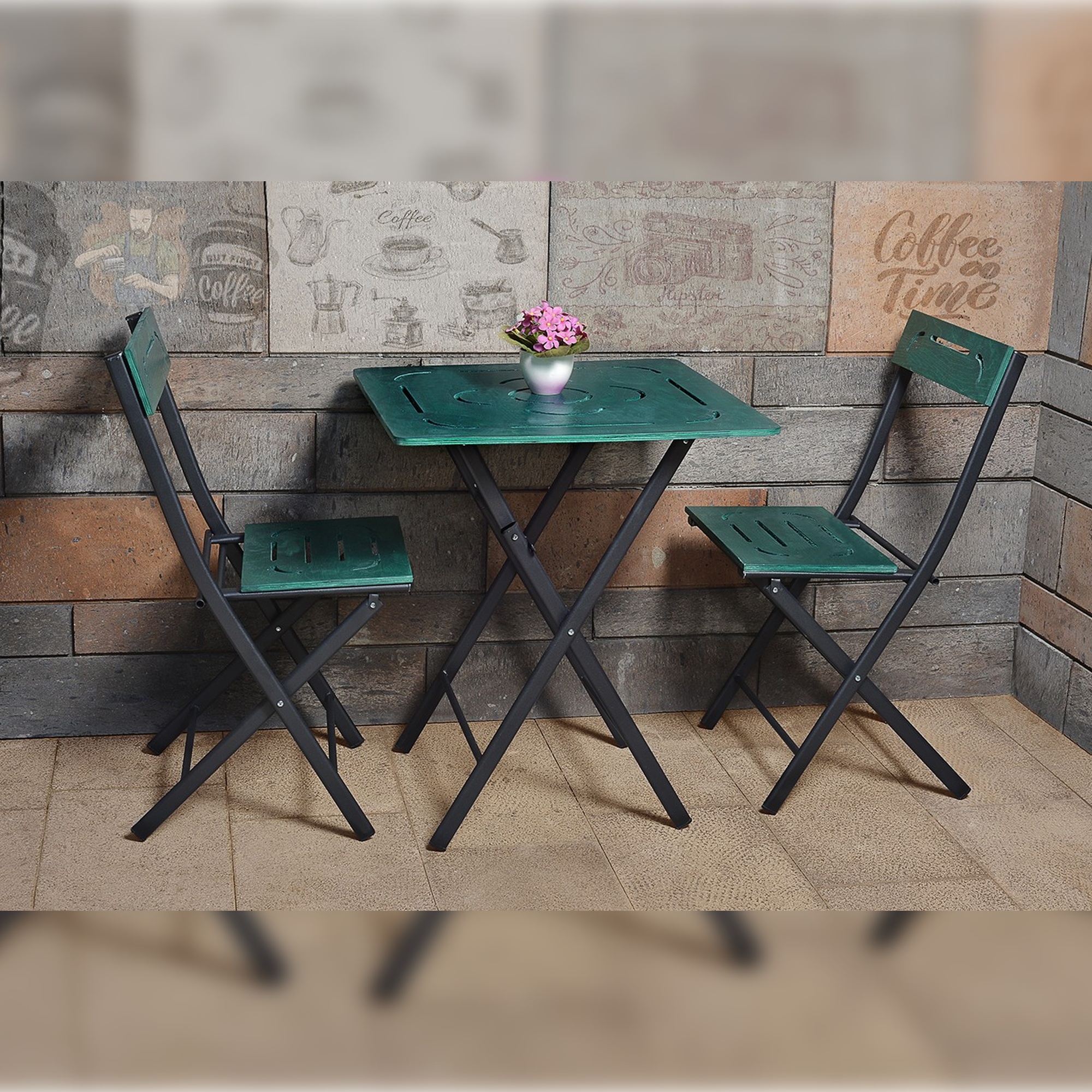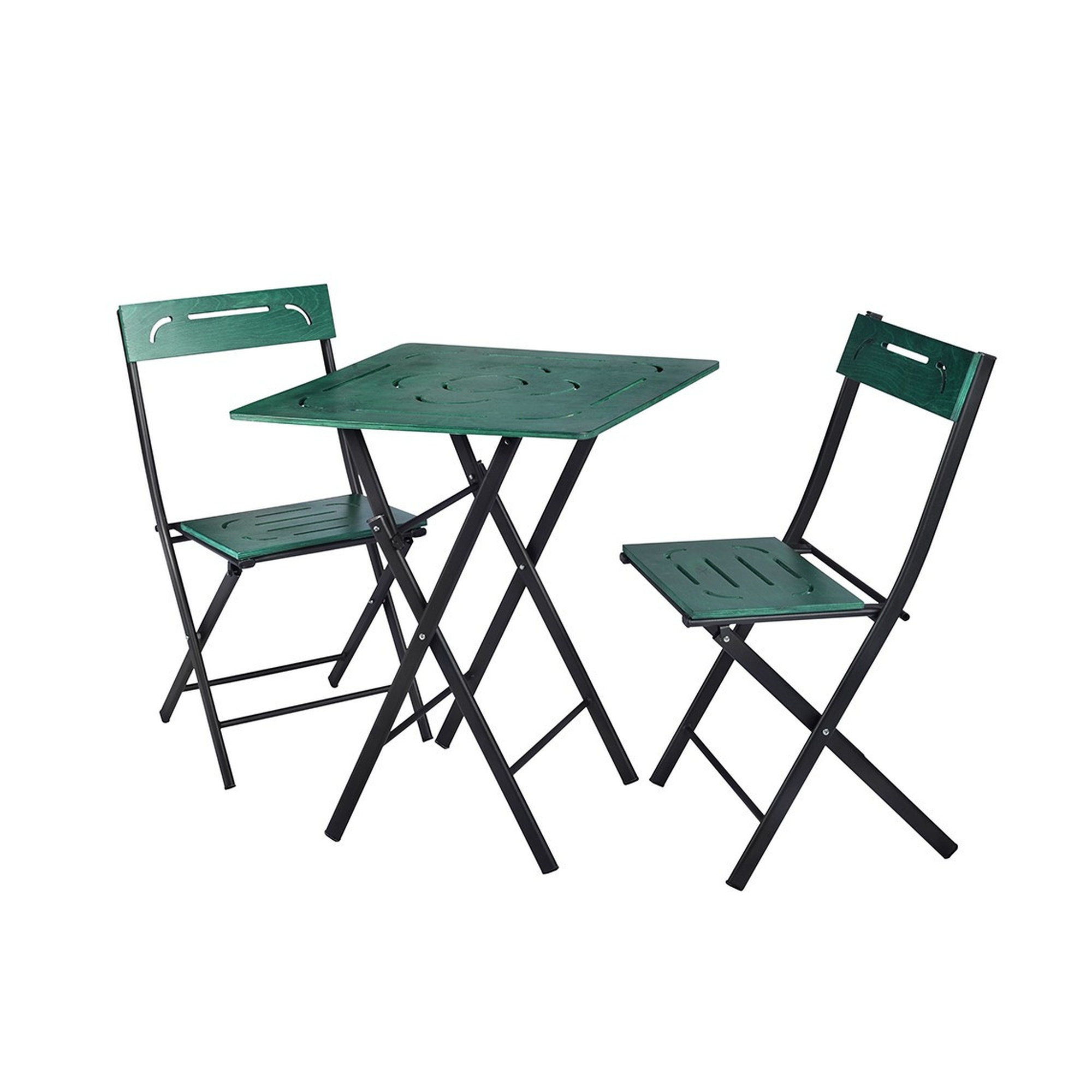 Ensemble de table et chaises de jardin (3 pièces) Vert et noir 100% MDF Jambes en métal Mesures du tableau: L: 60 cm A: 73 cm Fonds: 60 cm Mesures du président: L: 40 cm A: 83 cm Fonds: 40 cm Chaise de siège A: 45 cm Grande capacité de stockage Table polyvalente Monté