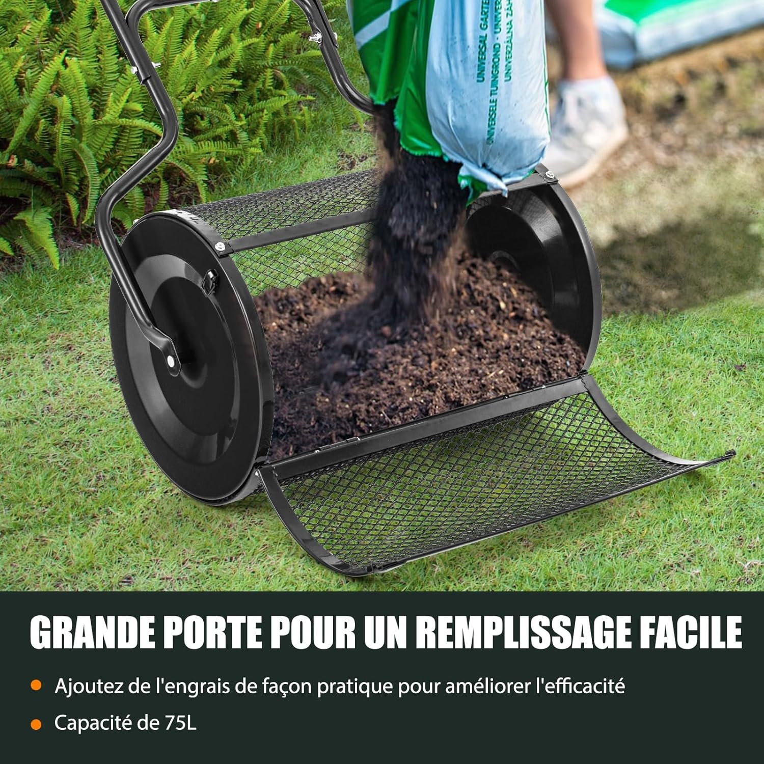 Épandeur de compost d68cm pour pelouses et jardin, capacité 75l, épandeur en treillis métallique noir