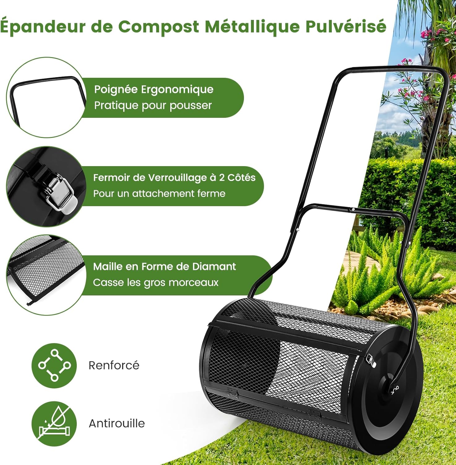 - Construction métallique de qualité : Construit à partir d'un cadre métallique robuste, l'épandeur de compost est résistant à la déformation, durable et solide. Il a également été recouvert d'une finition verte pour le rendre élégant et durable, et le revêtement en poudre le rend résistant à la rouille et à l'eau.