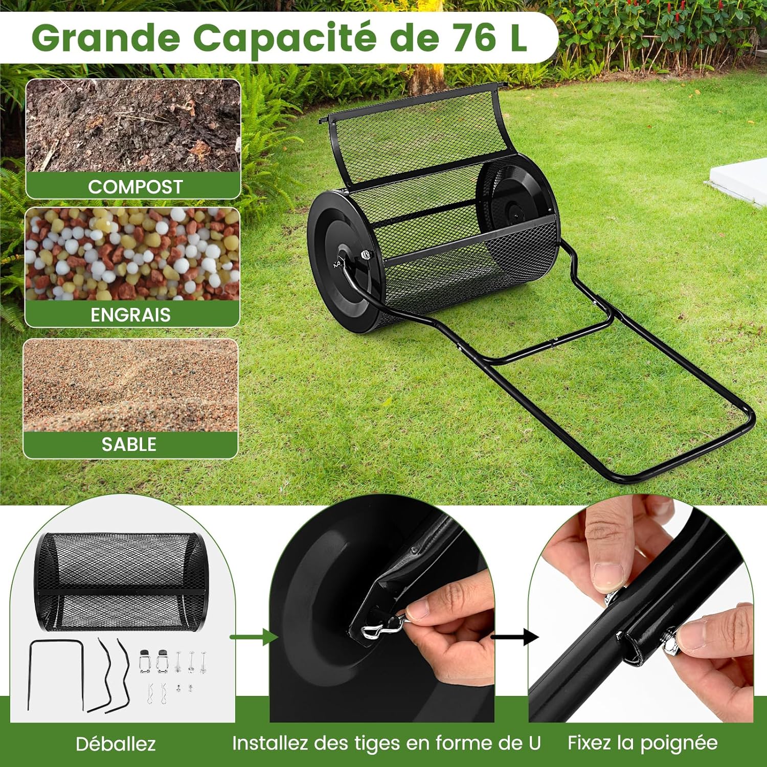 Épandeur de compost de 60cm, capacité 76l, avec poignée ergonomique en u, épandeur à engrais rouleau noir
