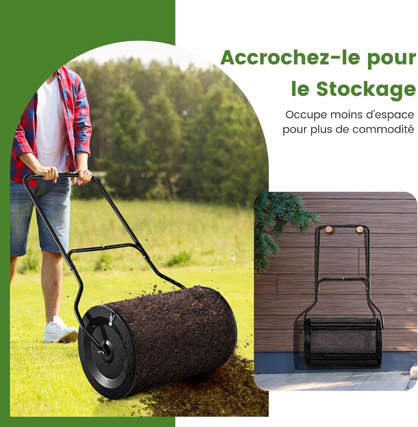 - Conception ergonomique: Équipé d'une poignée en U conviviale, vous pouvez pousser et tirer l'épandeur de tourbe en douceur sur la pelouse. La poignée vous permet d'épandre de l'engrais sans avoir à vous pencher. De plus, la poignée permet de suspendre l'épandeur de compost au mur pour le ranger.