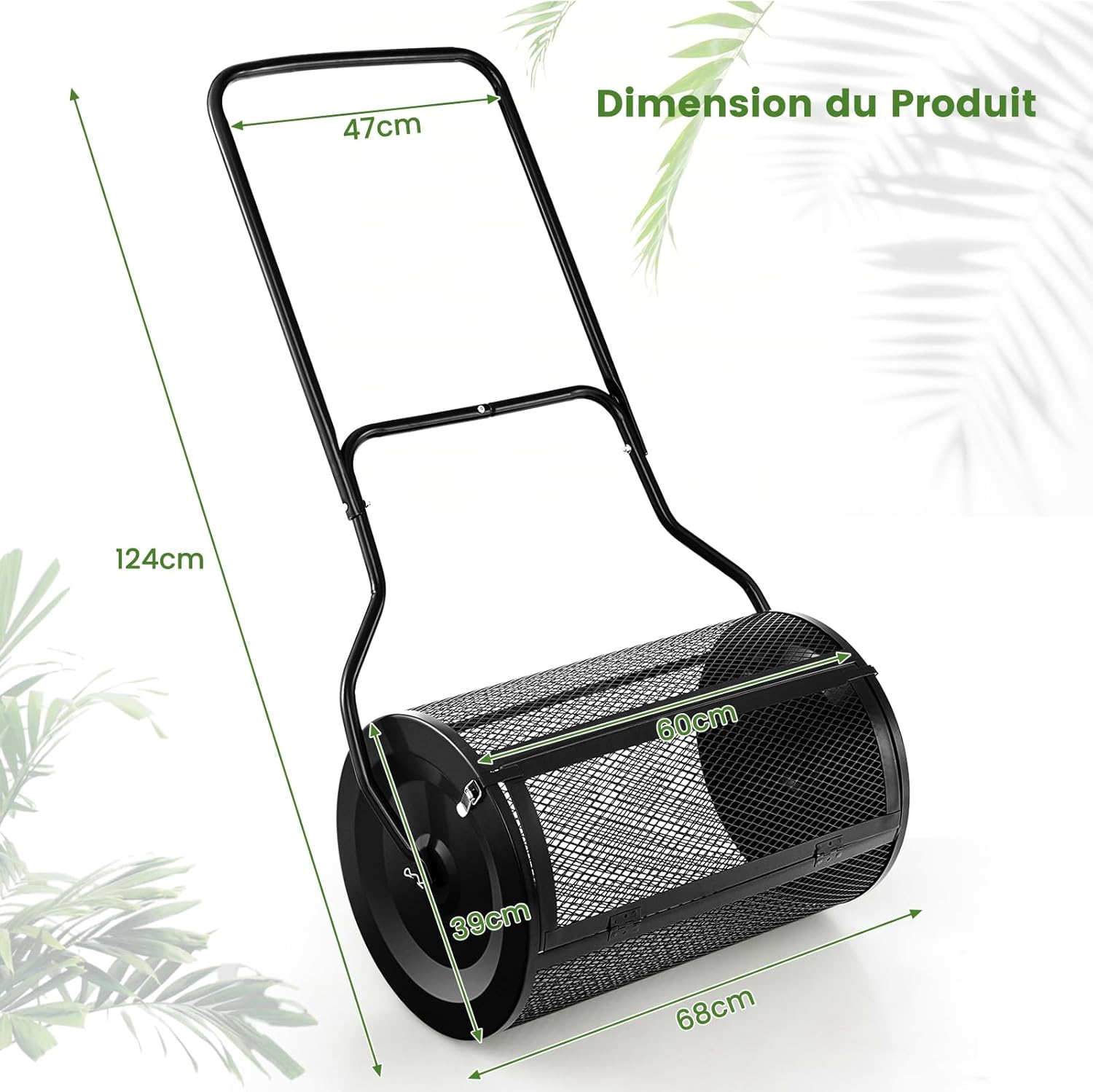 | Libellé | Épandeur de compost de 60cm, capacité 76l, avec poignée ergonomique en u, épandeur à engrais rouleau noir |