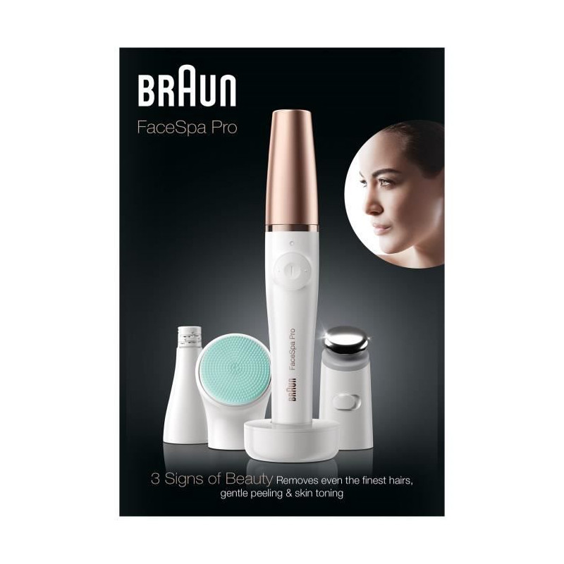 face913 - epilateur 3en1 rechargeable wet & dry - Epilateur rechargeable 3en1 FaceSpa Pro Braun FACE913 : Premier épilateur visage, de nettoyage et de raffermissement de la peau au monde. L'épilateur FACE913 comprend un épilateur visage, une brosse nettoyante et une brosse vitalisante. Pour une épilation précise, un nettoyage des pores en profondeur, un adoucissement de la peau et une activation de la circulation sanguine. L'épilateur visage vous donnera un teint lisse et clair : Il agit sur des poils 4 fois plus courts que ce que la cire peut attraper. La brosse nettoyante visage : Nettoie votre visage 6 fois plus efficacement d'un nettoyage manuel. La tête de micro-pulsation pour un raffermissement visible : Elle s'associe à votre sérum ou votre crème pour raffermir visiblement votre peau.Un épilateur visageQui agit sur des poils 4 fois plus courts que ce que la cire peut attraper pour un teint lisse et clair.La brosse nettoyante visageNettoie votre visage 6x plus efficacement qu'un nettoyage manuel (Brosse Velvet).La tête de micro-pulsationsS'associe à votre sérum ou votre crème pour raffermir visiblement la peau.