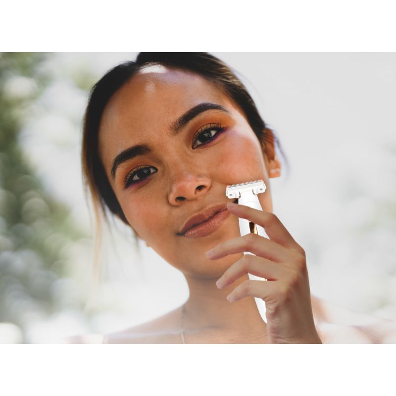 La tête de lame hypoallergénique à double face glisse en douceur le long des contours de votre visage et de votre corps, en maintenant un contact étroit avec la peau pour un rasage uniforme.