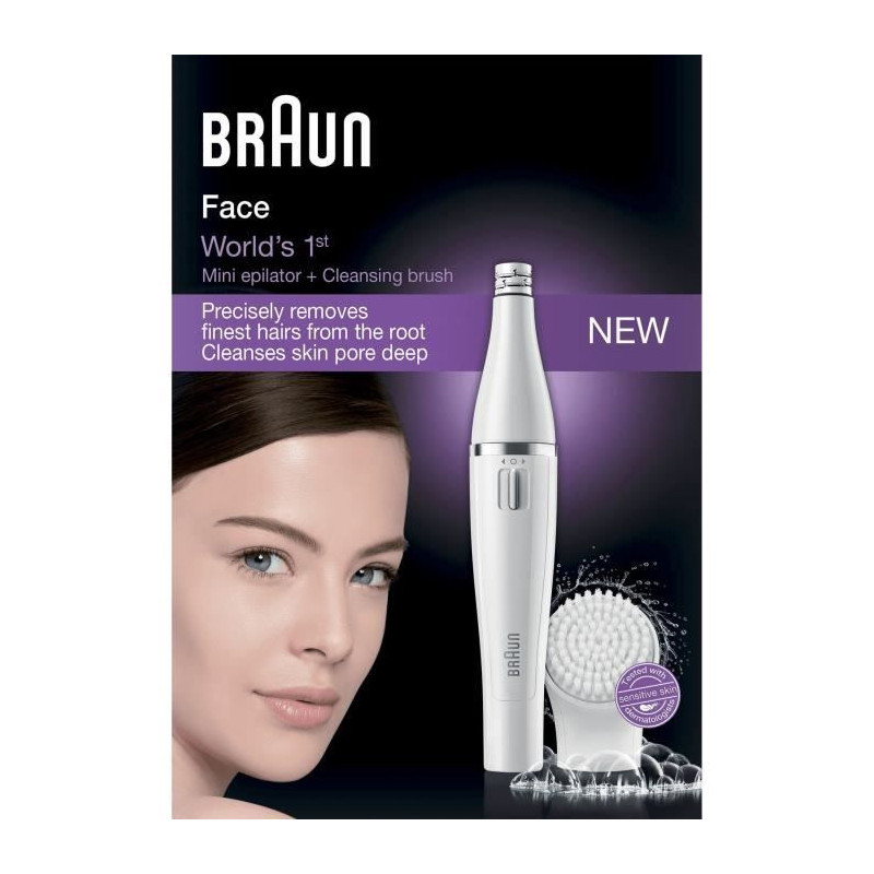 se810 - épilateur visage et brosse nettoyante - Le Braun Face vous permet de profiter de deux traitements en un seul appareil - changez simplement d'accessoires.Enlevez les poils du visage à la racine avec précision grâce à l'épilateur visage ou nettoyez vos pores en profondeur avec la brosse visage. Vous voulez vous épiler le menton, la lèvre supérieure et le front ou entretenir vos sourcils ?Sur ces zones délicates, la précision est la clé.La conception élégante et compacte du Braun Face vous permet de vous en servir comme un mascara pour un contrôle et une précision absolus.Il enlève les poils à la racine: jusqu'à 4 semaines de peau nette.Il est si doux que vous avez fini avant même de vous en rendre compte.La tête super étroite possède 10 micro-ouvertures qui capturent en douceur même les poils les plus fins jusqu'à 0,02mm. Et avec 200 mouvements de pinces par seconde, il est considérablement plus rapide et plus minutieux qu'une pince à épiler manuelle.Nettoie votre visage 6x mieux qu'à la main.Épilez-vous avec une précision absolue sur simple pression d'un boutonIl restaure en douceur une pureté et un éclat de la peau incroyable en enlevant le maquillage et les impuretés. Grâce à des centaines de micro-oscillations, la brosse nettoyante Braun Face fonctionne 6 fois mieux qu'un nettoyage à la main.Il exfolie et enlève les cellules mortes et encourage le rajeunissement de la peauIntégrez le nettoyage de vos pores en profondeur dans votre rituel sous la doucheBraun Face étant étanche à 100%, vous pouvez naturellement intégrer un nettoyage doux et minutieux dans votre rituel sous la douche. Cela vous permet de profiter des bons côtés sans les mauvais, pour préparer votre peau à mieux absorber vos crèmes et lotions.Pas de surprise car il a été testé par des dermatologues et convient même aux peaux sensibles.