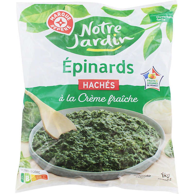Ingrédients : Épinards 70 % ; eau ; crème fraîche 7 % ; lactose et protéines de lait ; amidon de riz ; sel ; poudre de lait écrémé ; farine de blé ; arôme naturel de muscade ; arôme naturel de poivre