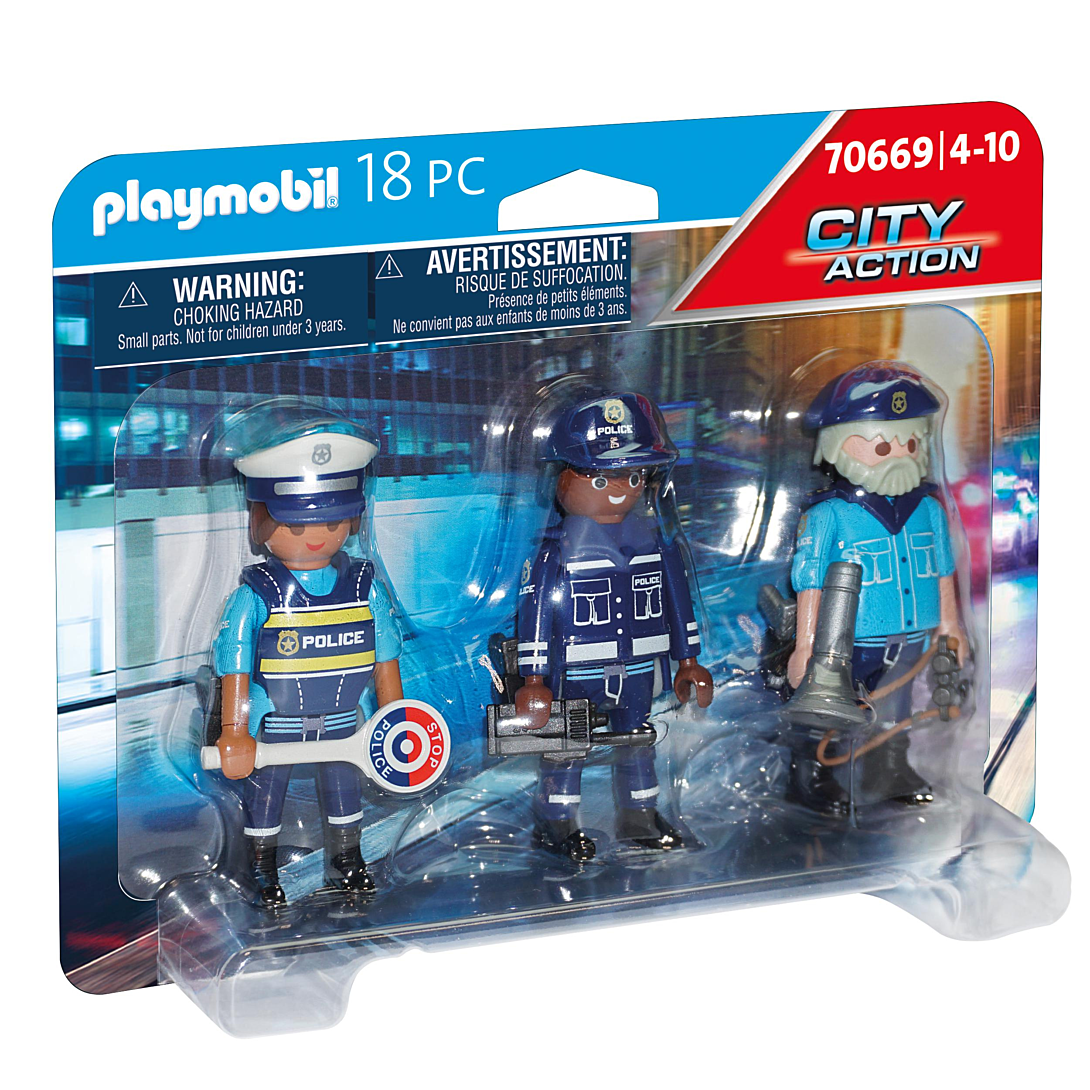 Contient 3 personnages, 1 talkie-walkie, des pistolets, 1 stop police, 1 mégaphone et 1 paire de jumelles.