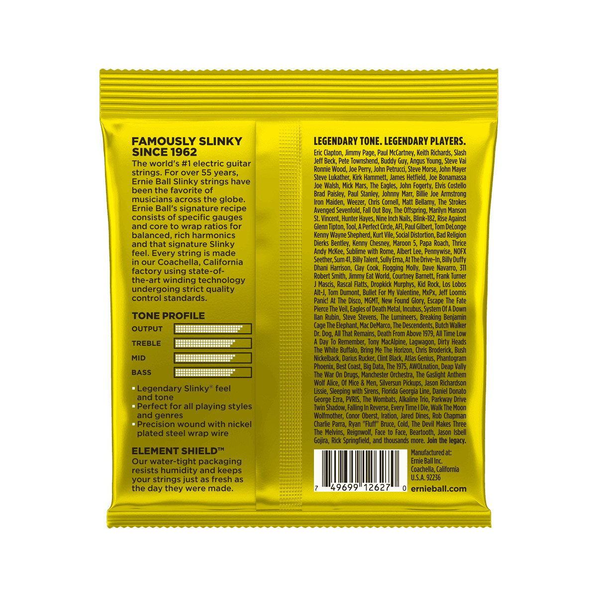 Les Regular Slinky font parties des cordes favories de nombreux musiciens dans le monde : Eric Clapton, John Mayer, Steve Vai entre autres. Les spécifications de fabrications des cordes Ernie ball en font des cordes très durables tout en conservant une performance élevée.