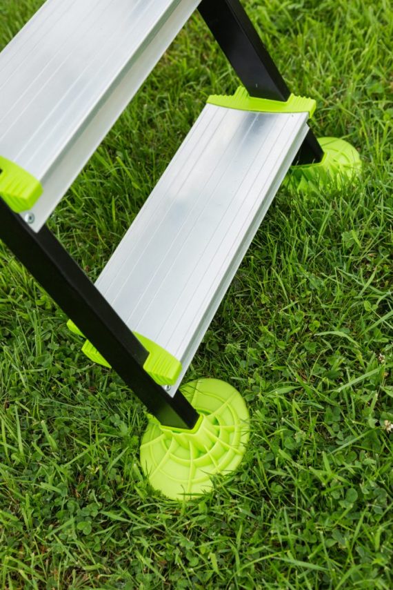 L'escabeau de jardin Garden Step est en aluminium. Grâce à ses sabots spécialement conçus pour l'extérieur, il ne s'enfonce pas dans la pelouse et reste stable dans les graviers.