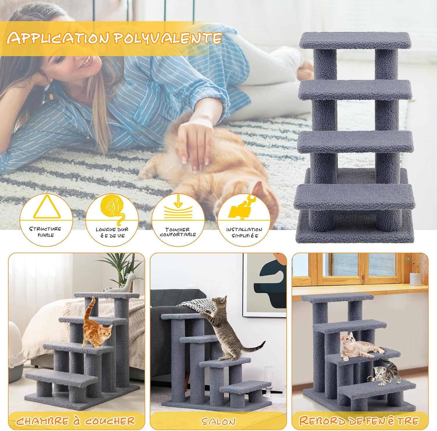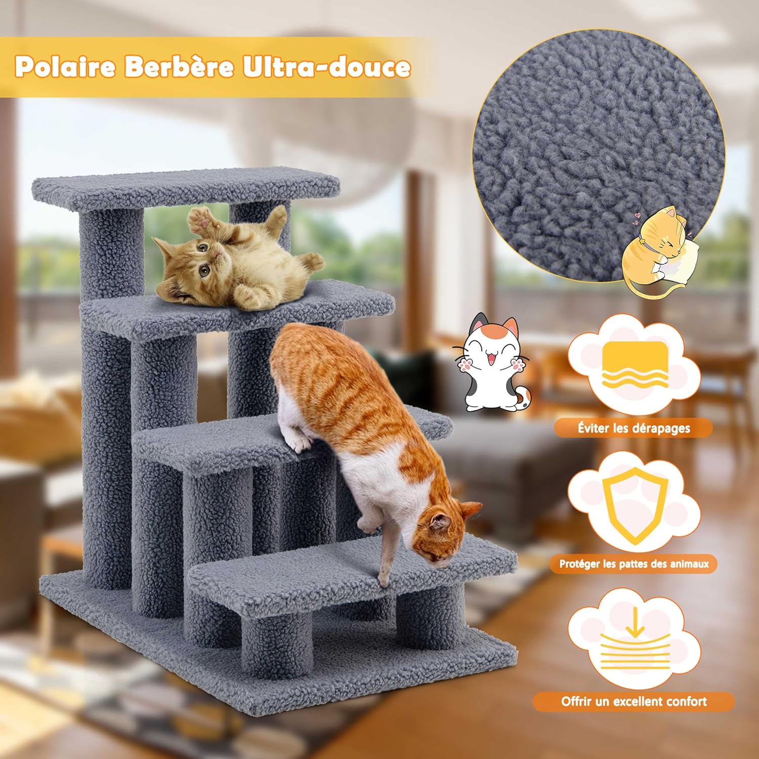 Les chats sont des trésors dans le cœur de chaque propriétaire.La structure a une forte capacité de charge, recouverte de laine d’agneau douce, et a une forte résistance aux rayures pour protéger le chat contre les dommages. Il peut satisfaire la personnalité active du chat et satisfaire pleinement son style de vie. 4 étages d’escaliers offrent suffisamment d’espace de jeu pour les chats