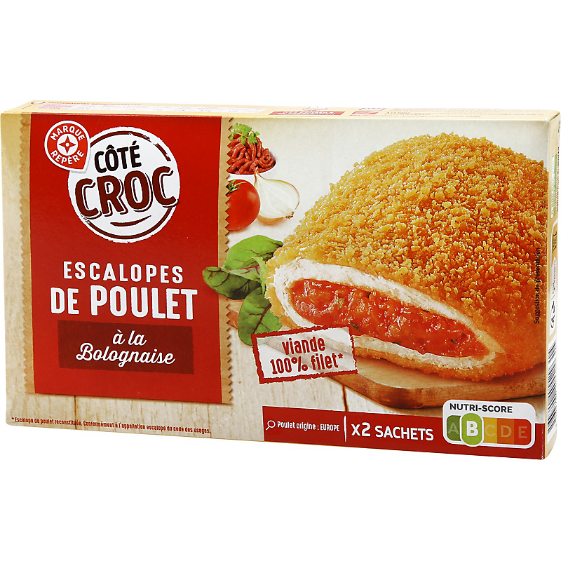 Préparation à base de filets de poulet traités en salaison reconstitués et aromatisés, garnie d’une sauce bolognaise à la viande de bœuf et de poulet aromatisée, panée, frite et cuite. COTE CROC