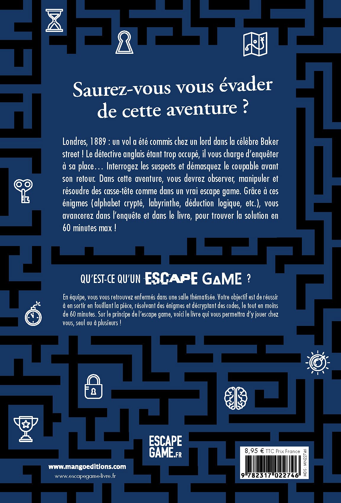 Londres, 1889 : un vol a été commis chez un lord dans la célèbre Baker street ! Le détective anglais étant trop occupé, il vous charge d’enquêter à sa place… Interrogez les suspects et démasquez le coupable avant son retour. Dans cette aventure, vous devrez observer, manipuler et résoudre des casse-tête comme dans un vrai escape game. Grâce à ces énigmes (alphabet crypté, labyrinthe, déduction logique, etc.), vous avancerez dans l’enquête et dans le livre, pour trouver la solution en 60 minutes max !
