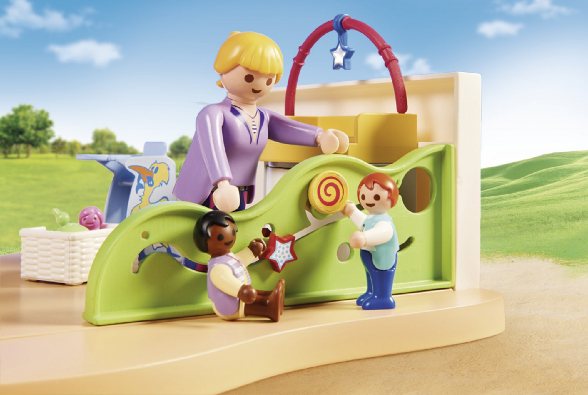 Plus produit - L\'espace crèche pour bébés contient une table à langer avec arceau de jeu, un autre arceau pour jouer au sol, une chaise haute et une paroi avec des jouets à faire coulisser pour exercer sa motricité.\n- Les jouets suspendus aux arceaux sont interchangeables.\n- Les bébés peuvent être placés dans la chaise haute et sur le pot. - Les bébés peuvent porter le bavoir. \n\nL\'Espace crèche pour bébés peut être combiné avec le Centre de loisirs (réf. 70280).