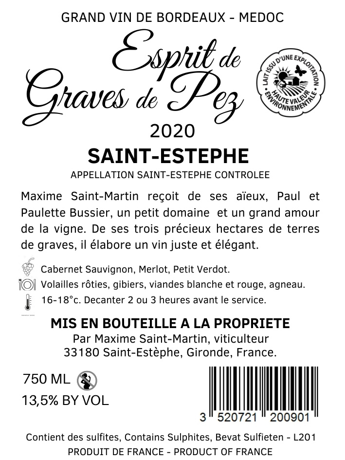 | Libellé | ESPRIT DE GRAVES DE PEZ, 2020 - Saint-Estèphe AOP - Rouge - 75 cl |
