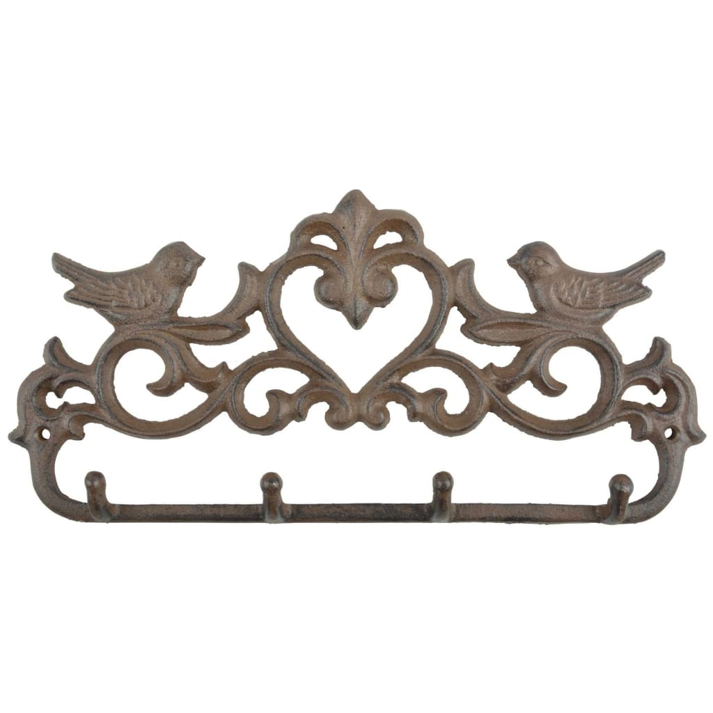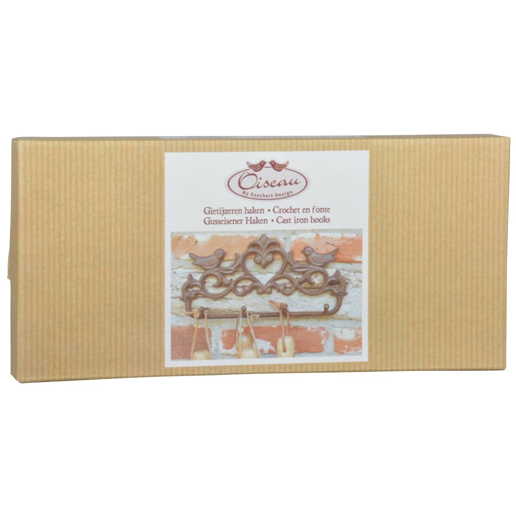 Ils sont ornés d'une paire d'oiseaux et d'un motif orné et sont idéaux pour les manteaux, les chapeaux et les accessoires ou même les torchons de cuisine. La rangée de crochets de la marque Esschert Design est livrée dans une boîte cadeau en couleur et comporte deux trous de fixation.