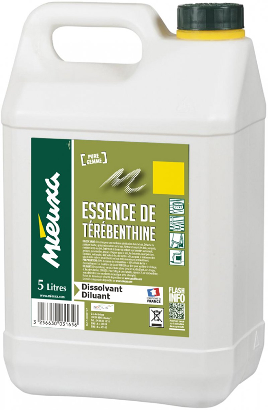 Dissolvant : des cires pour une meilleure pénétration dans le bois. Détache la peinture fraîche, graisse et goudron sur le bois. Nettoie et nourrit les bois, parquets, meubles bruts ou cirés. Entretient et donne du brillant aux tomettes sans émail, ardoises, parefeuilles, briques. Prépare aussi le bois , les boiseries avant peinture. De même , mélangée à de l'huile de lin , elle est très efficace pour le traitement des sols en terre cuite et des éléments s en bois. Préparation: 50% d'essence de térébenthine, 50% d'huile de lin et éventuellement 1 à 2 cuillères de siccatif Mieuxa par litre pour accélérer le séchage. Diluant: Des peintures vernis à l'huile et des cires. De la pâte à bois, des cirages, et des cires durcies. Conseil: pour 500g de cire d'abeille, rajouter 2l de térébenthine, vous obtiendrez une excellente encaustique prête à l'emploi.