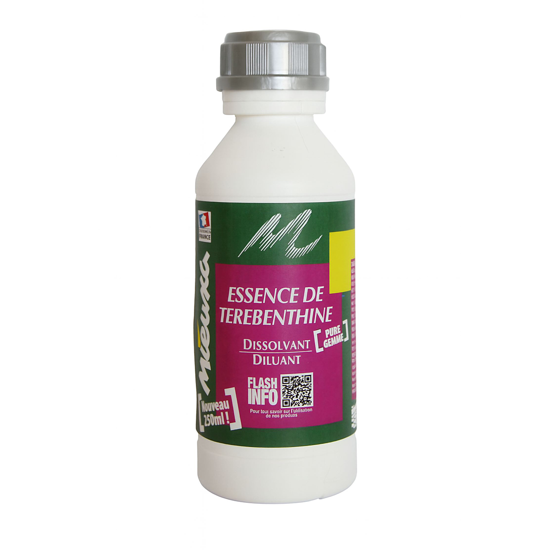 Dissolvant : des cires pour une meilleure pénétration dans le bois. Détache la peinture fraîche, graisse et goudron sur le bois. Nettoie et nourrit les bois, parquets, meubles bruts ou cirés. Entretient et donne du brillant aux tomettes sans émail, ardoises, parefeuilles, briques. Prépare aussi le bois , les boiseries avant peinture. De même , mélangée à de l'huile de lin , elle est très efficace pour le traitement des sols en terre cuite et des éléments s en bois. Préparation: 50% d'essence de térébenthine, 50% d'huile de lin et éventuellement 1 à 2 cuillères de siccatif Mieuxa par litre pour accélérer le séchage. Diluant: Des peintures vernis à l'huile et des cires. De la pâte à bois, des cirages, et des cires durcies. Conseil: pour 500g de cire d'abeille, rajouter 2l de térébenthine, vous obtiendrez une excellente encaustique prête à l'emploi.