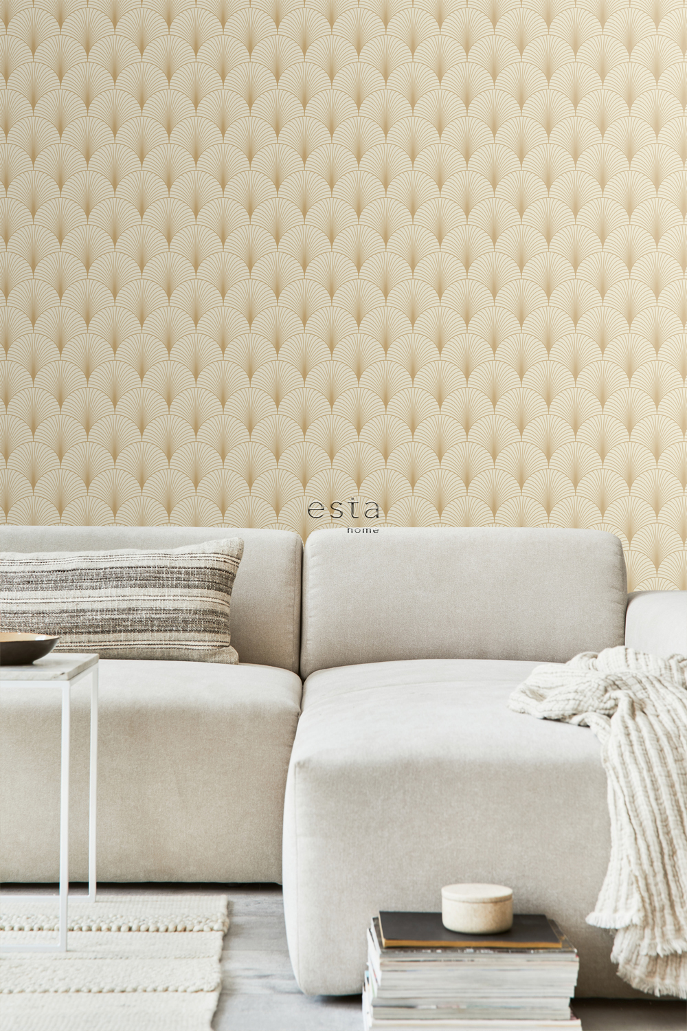 Habillez vos murs avec élégance grâce à ce papier peint à motif art déco en beige et or. Ce papier peint créera une ambiance vivante et chic dans votre pièce. Laissez-vous charmer par ce beau revêtement mural!
