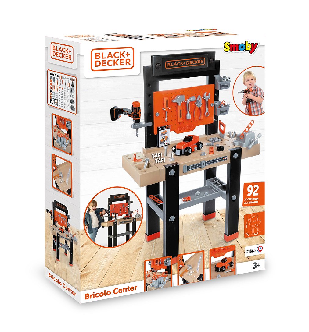 L'établi Bricolo Center Black + Decker offre de nombreuses possibilités de jeu ! Il te permettra de reproduire facilement tous les faits et gestes de papa et maman! Très complet, il est parfait pour appréhender les fonctions de bricolage. Tu pourras t'amuser à construire un véhicule, à assembler des objets, ou encore à jouer avec la fonction tape/tape clou ! Composé de 92 accessoires, l'établi comprend 7 outils (scie, marteau, clé plate, tournevis, pince, clé à pipe, clé à étau), 1 perceuse mécanique, des vis, des écrous, des clous, des planches de construction, 1 règle mécanique, ... Tous les accessoires trouveront leur place grâce aux grandes zones de rangement (dont 2 bacs) et aux 2 ailes de rangement supplémentaires ! L'établi Bricolo Center Black + Decker se distingue grâce à ses nombreux accessoires, qui te permettront de t'amuser pendant de longues heures tout en t'imaginant mille histoires ! A partir de 3 ans - Fabrication française.