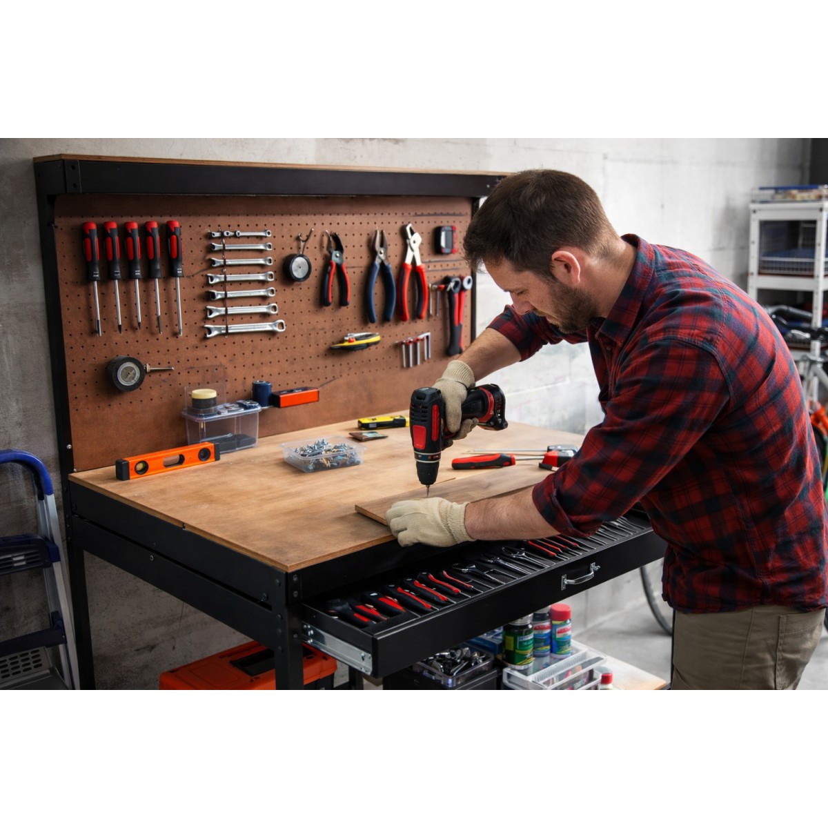 Le panneau perforé intégré permet de suspendre facilement les outils les plus utilisés grâce aux 8 crochets fournis, pour garder tout à portée de main et travailler plus efficacement. Le tiroir de rangement et l'étagère inférieure offrent des espaces supplémentaires pour stocker vis, accessoires, boîtes à outils ou matériel électrique.