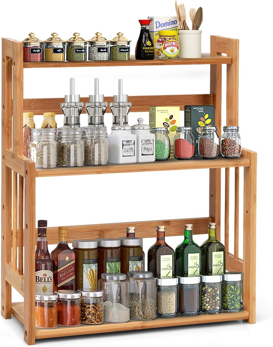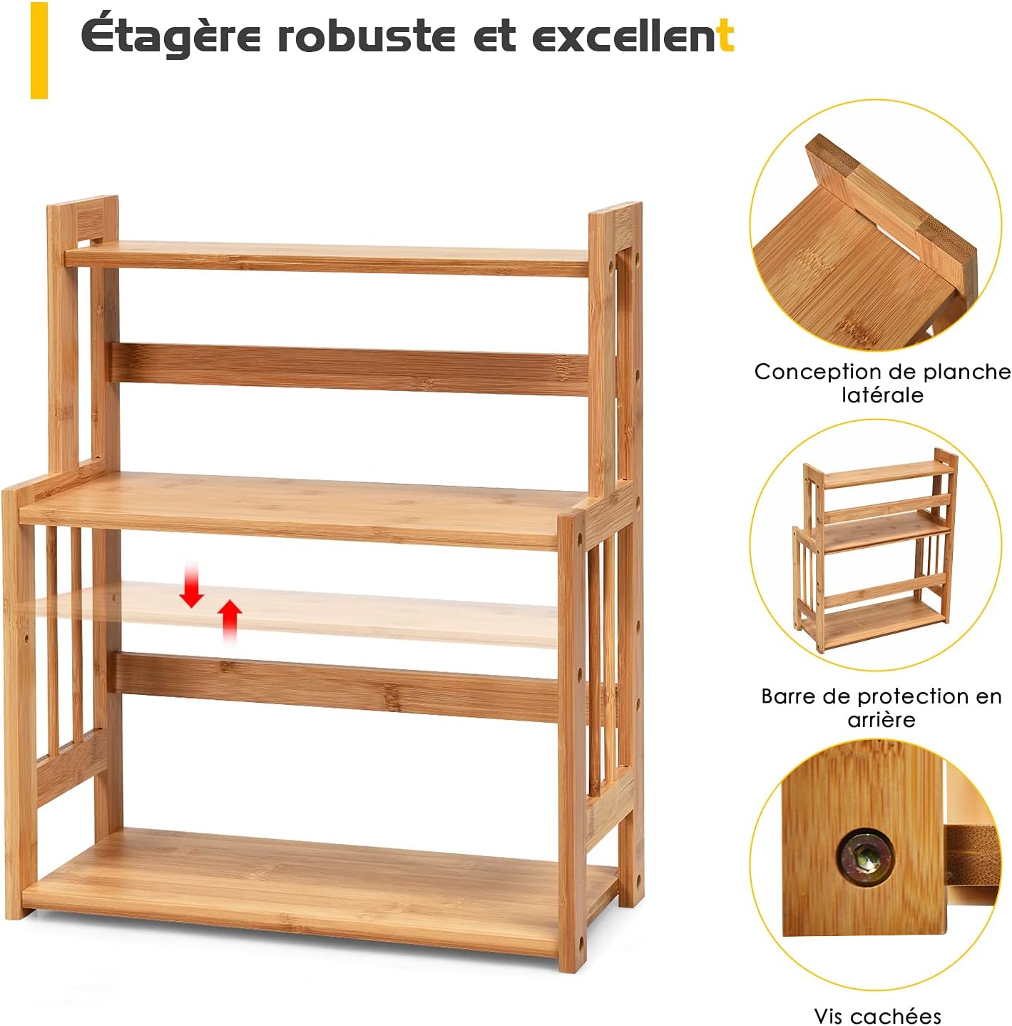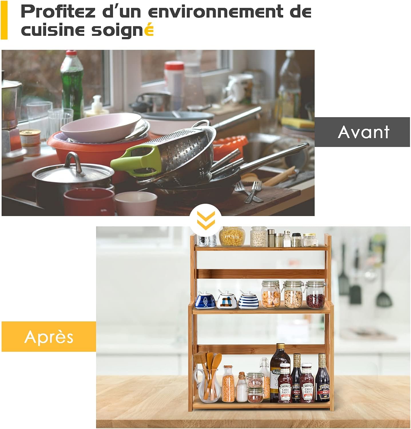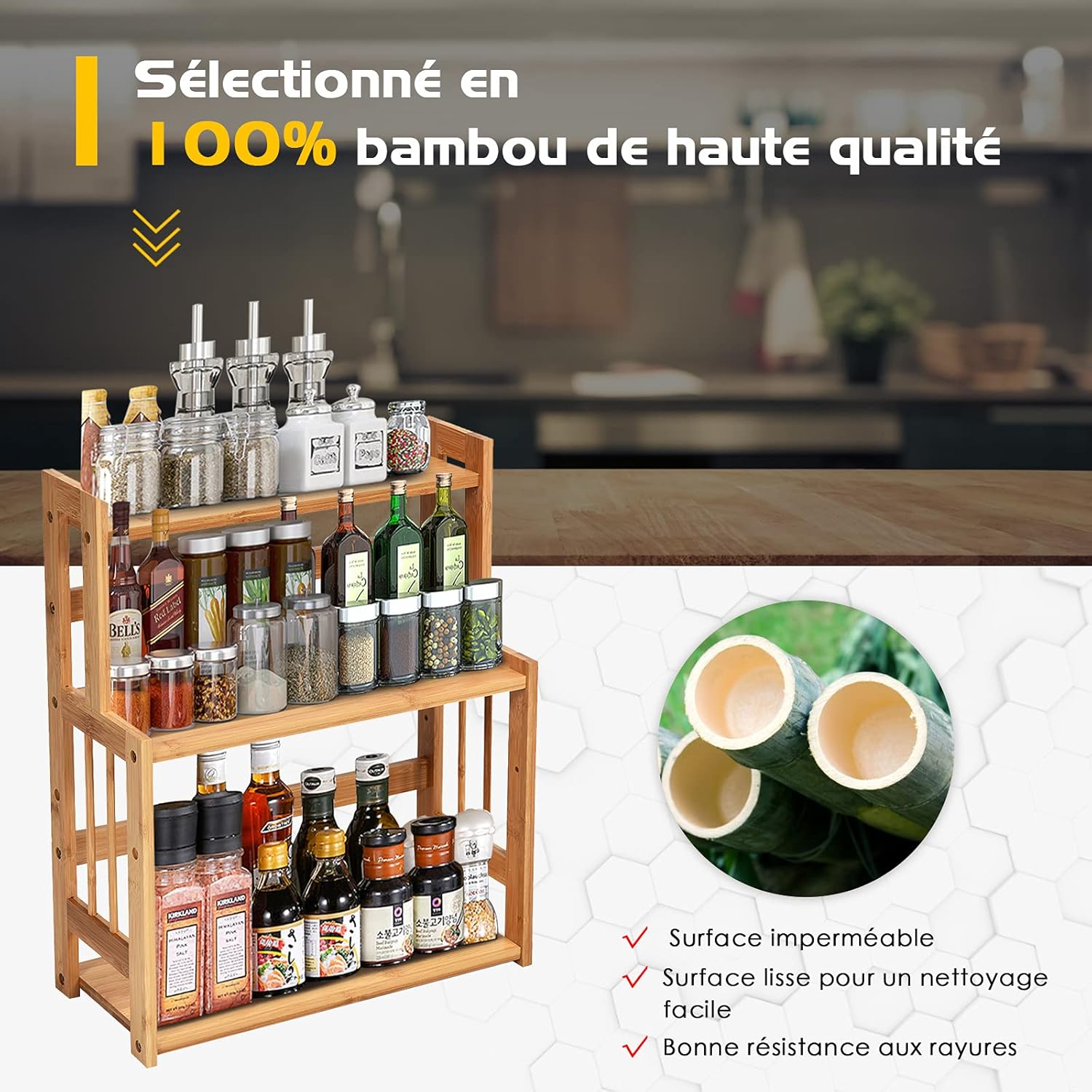 Libellé Étagère à épices en bambou naturel, porte-épice à 3 niveaux avec tablette réglable en hauteur